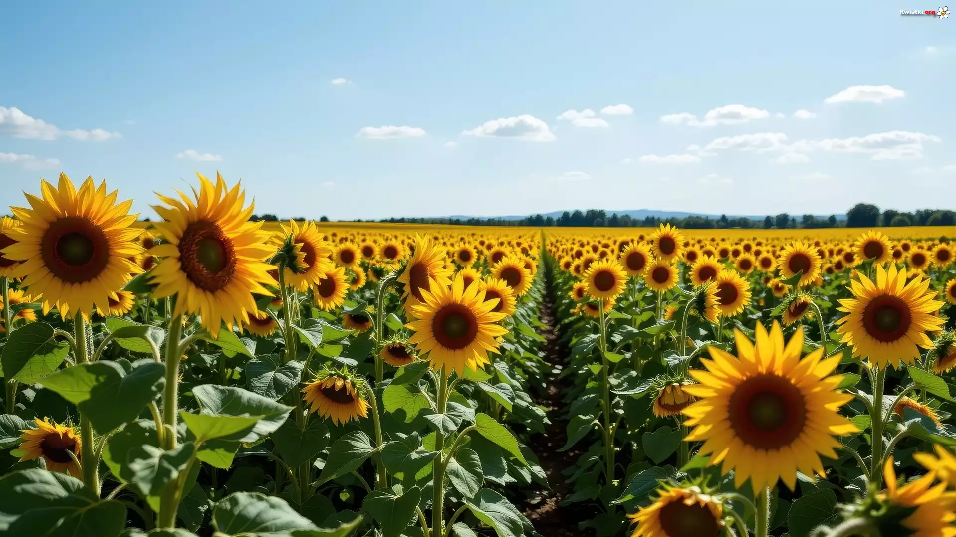 Słoneczniki, Pole, Drzewa, Niebo - Zdjęcia