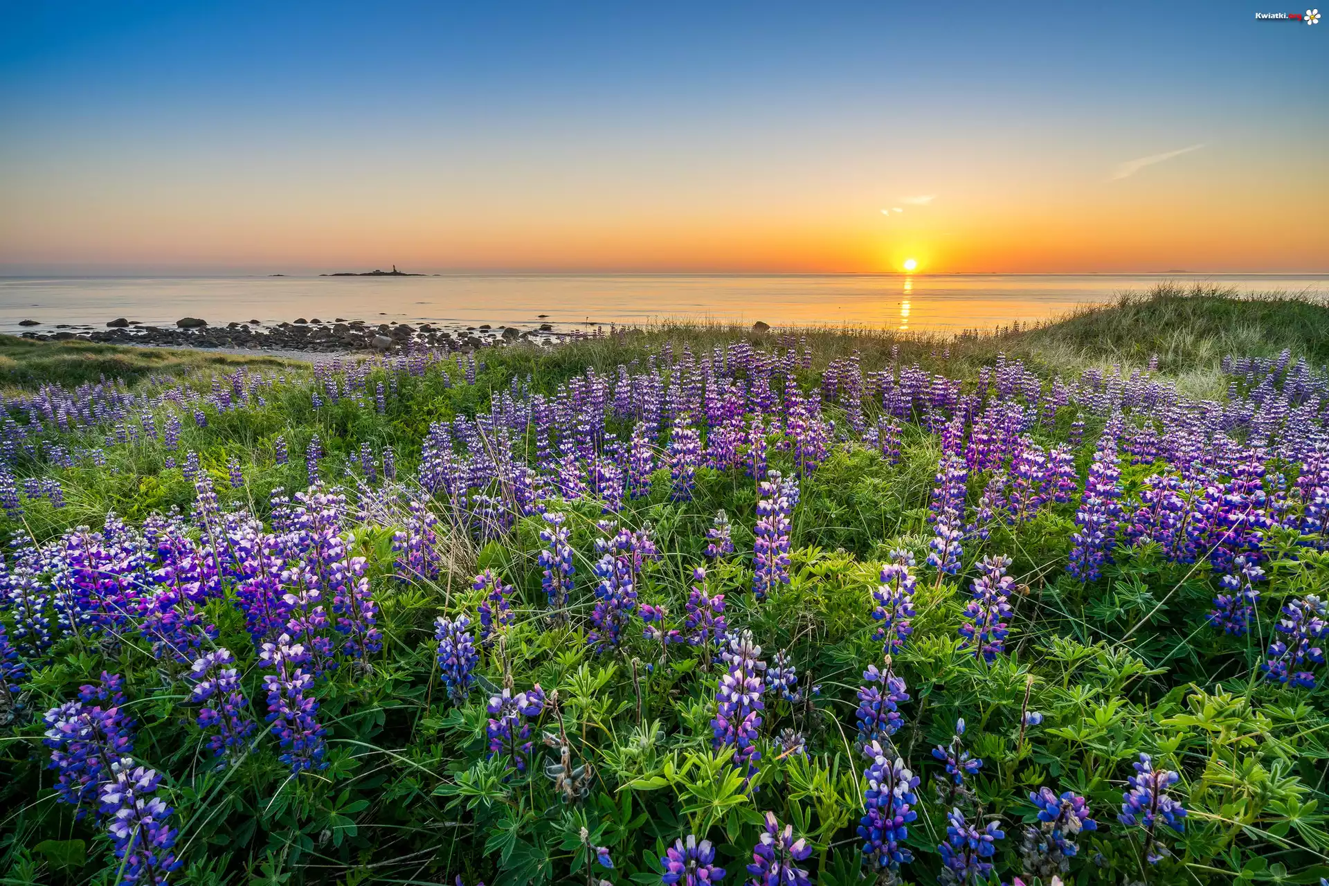 Kwiat Norwegia, Rogaland, Morze, Zachód słońca, Łubin