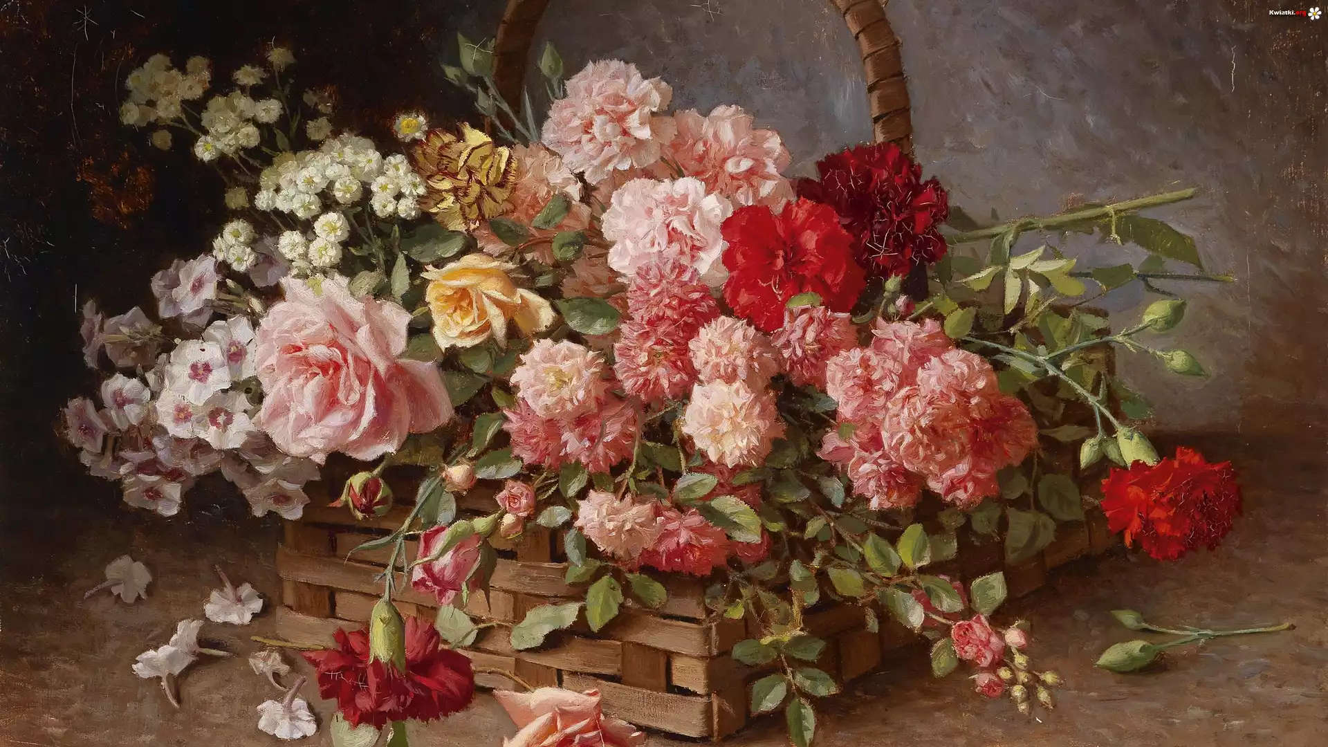 Kwiat Malarstwo, Obraz, Hans Buchner, Kosz, Kwiaty, Róże, Goździki