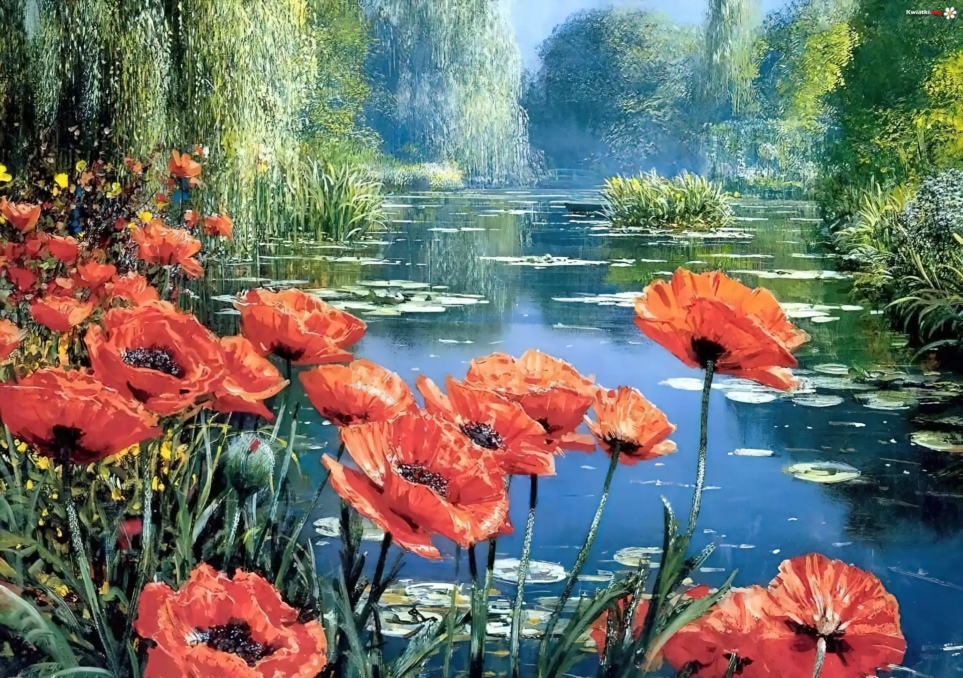 Obraz, Maki, Rzeka, Drzewa - Zdjęcia