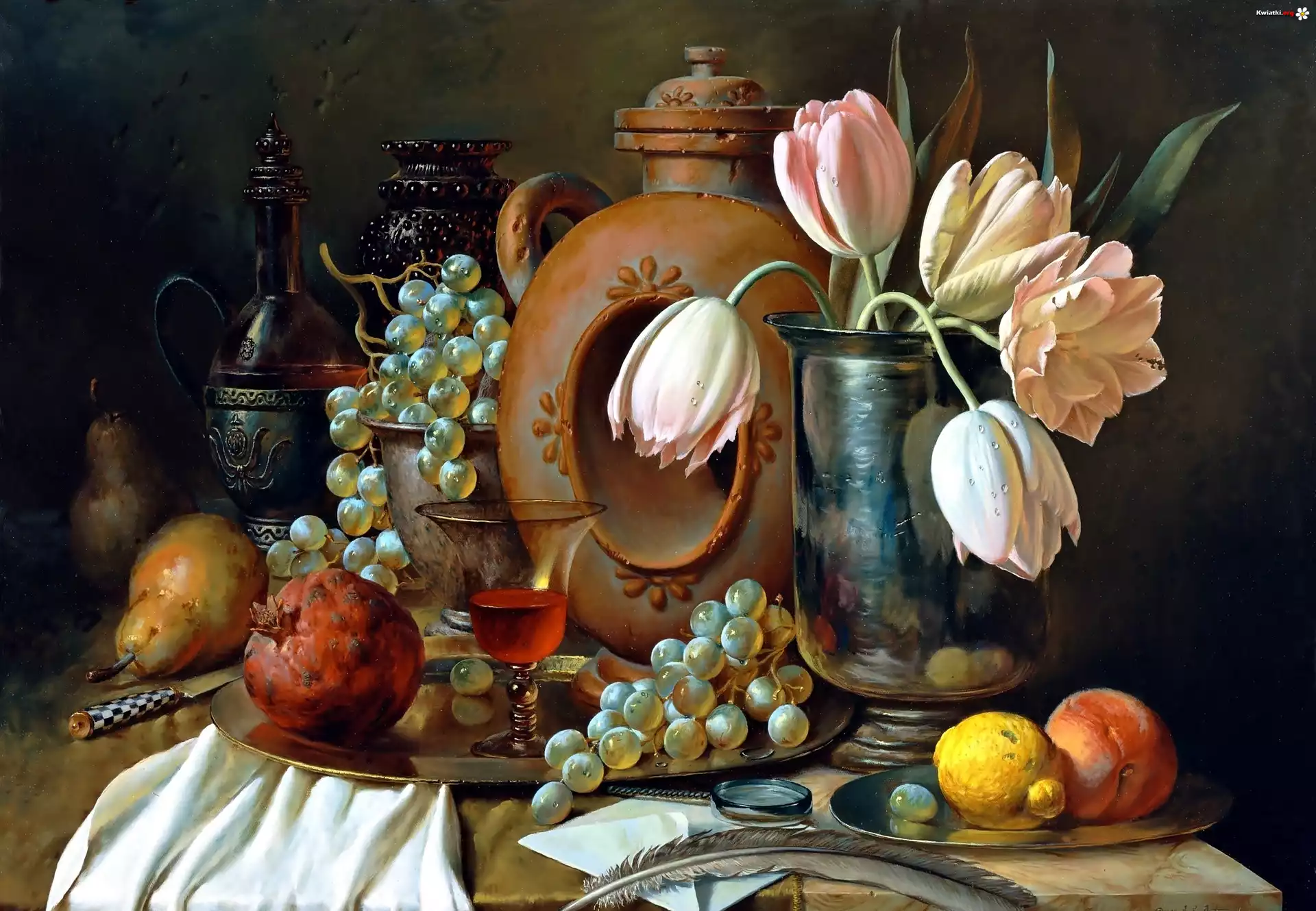 Malarstwo, Obraz, Kompozycja, Tulipany, Owoce, Granat, Gruszka, Winogrona - Zdjęcia