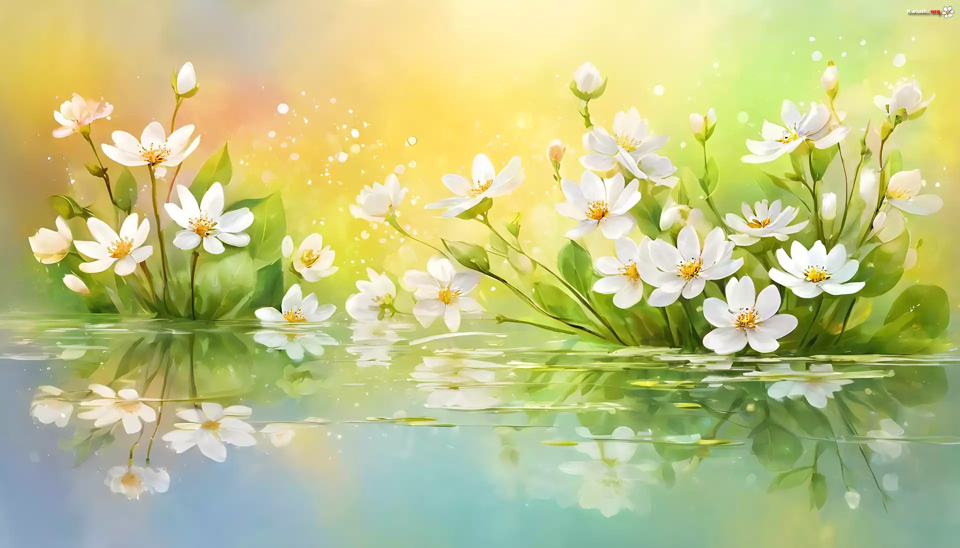 Białe, Kwiaty, Woda, Odbicie, Grafika AI - Zdjęcia