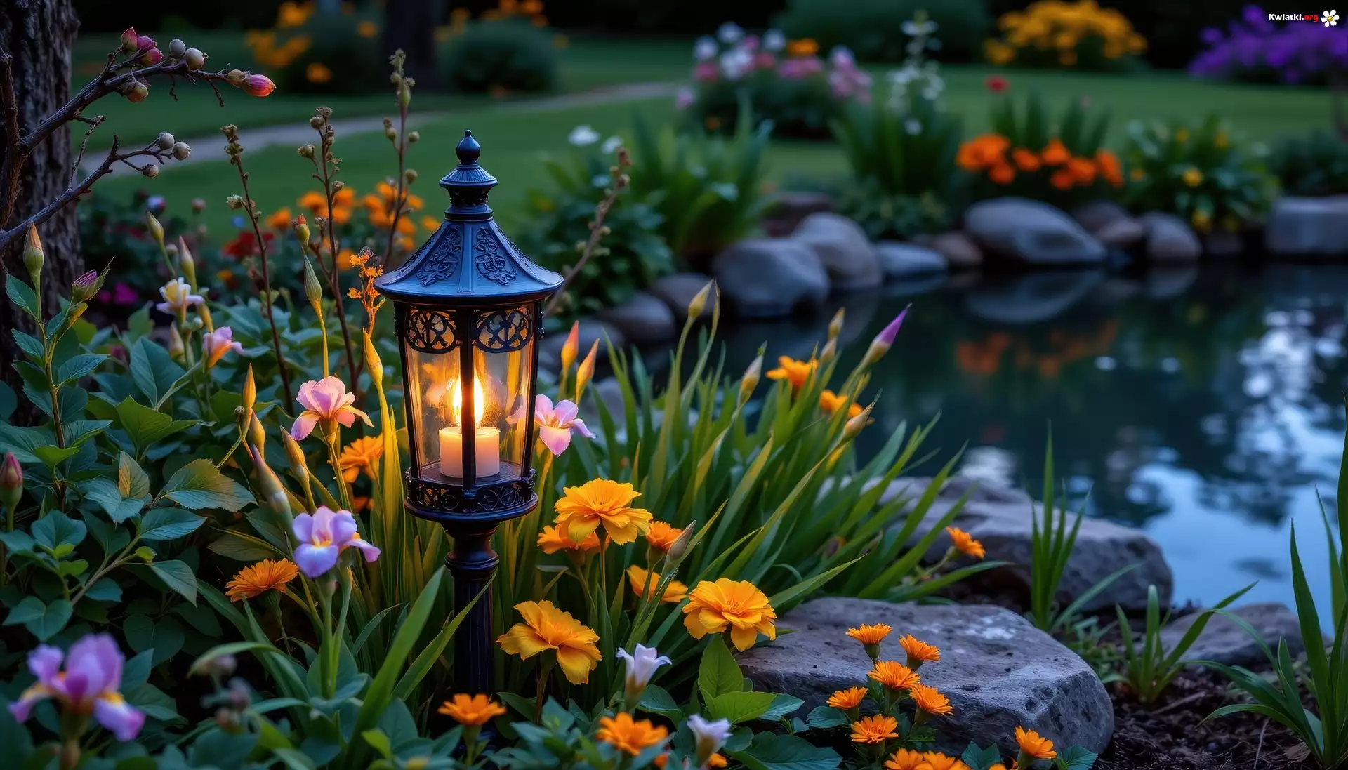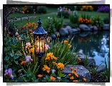 Latarnia, Kwiaty, Staw, Ogród, Grafika AI - Zdjęcia