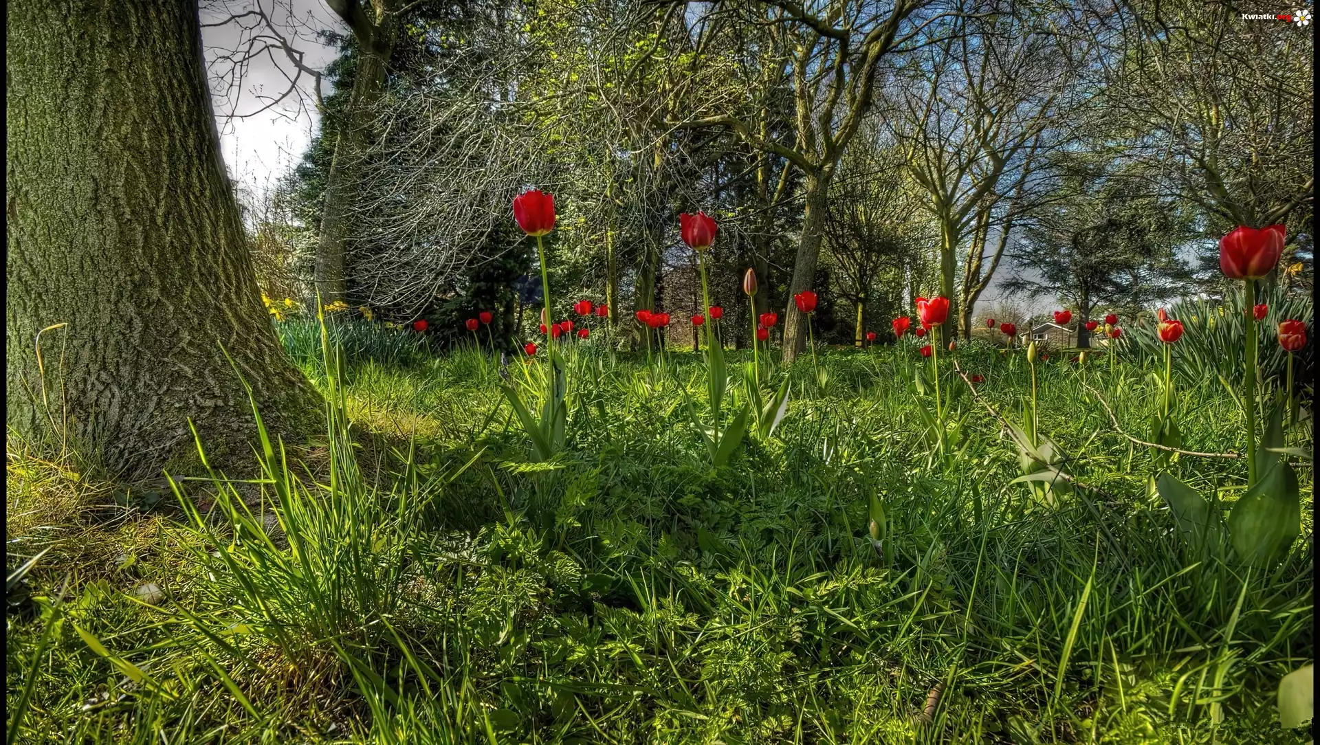 Kwiat Ogród, Drzewa, Trawy, Czerwone, Tulipany