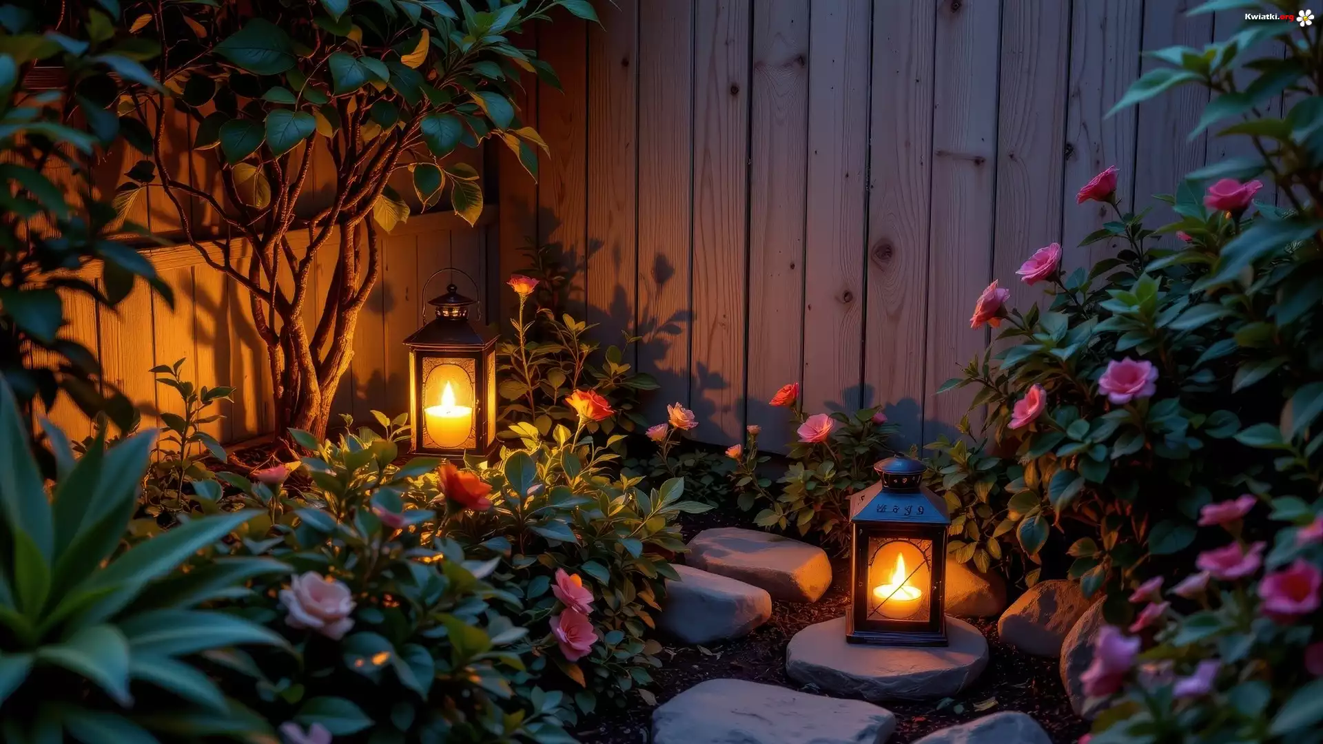 Ogród, Różowe, Kwiaty, Dwa, Lampiony, Ściana, Deski, Płaskie, Kamienie - Zdjęcia