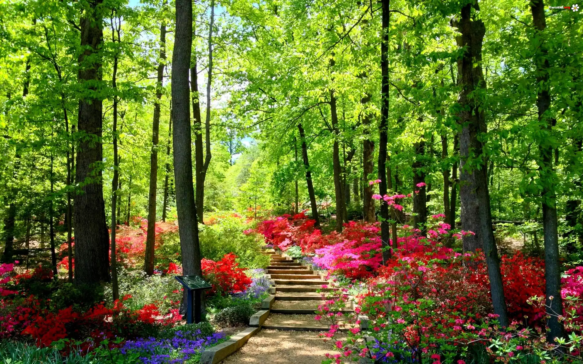 Kwiat Ogród, Schody, Drzewa, Kwiaty