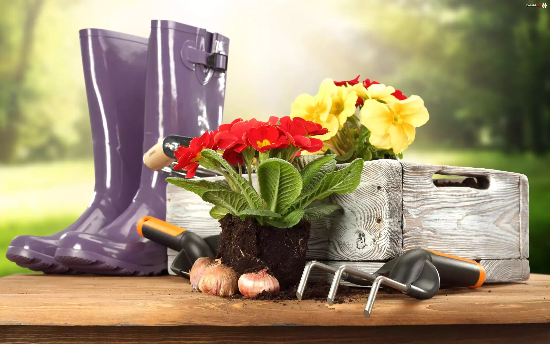 Kwiat Ogród, Kwiaty, Pierwiosnki, Narzędzia, Kalosze, Skrzynka