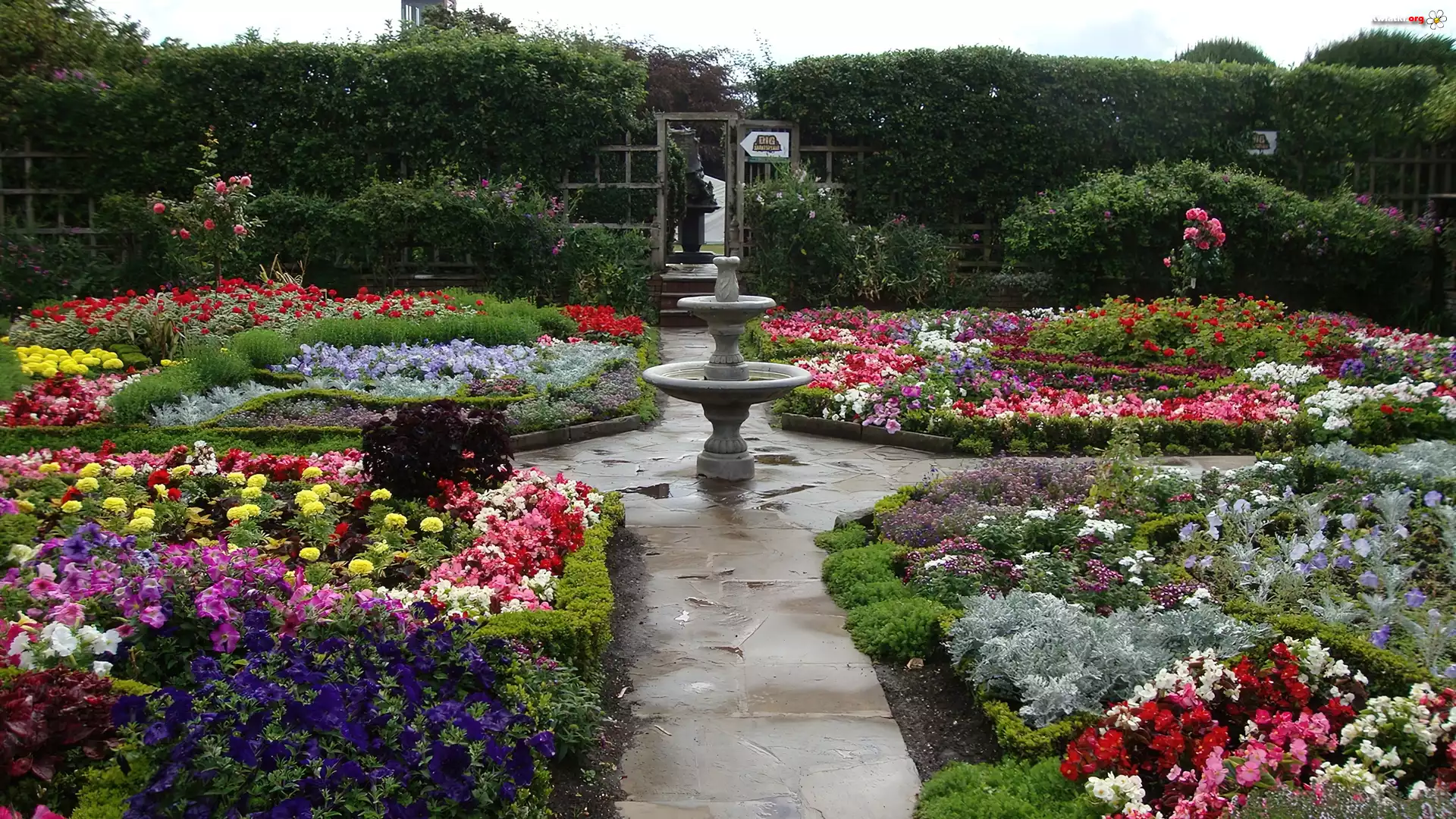 Kwiaty, Ogród, Fontanna - Zdjęcia