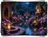 Ogród, Oczko wodne, Świece, Lampion, Różowe, Kwiaty, Rośliny, Murowany, Łuk - Zdjęcia