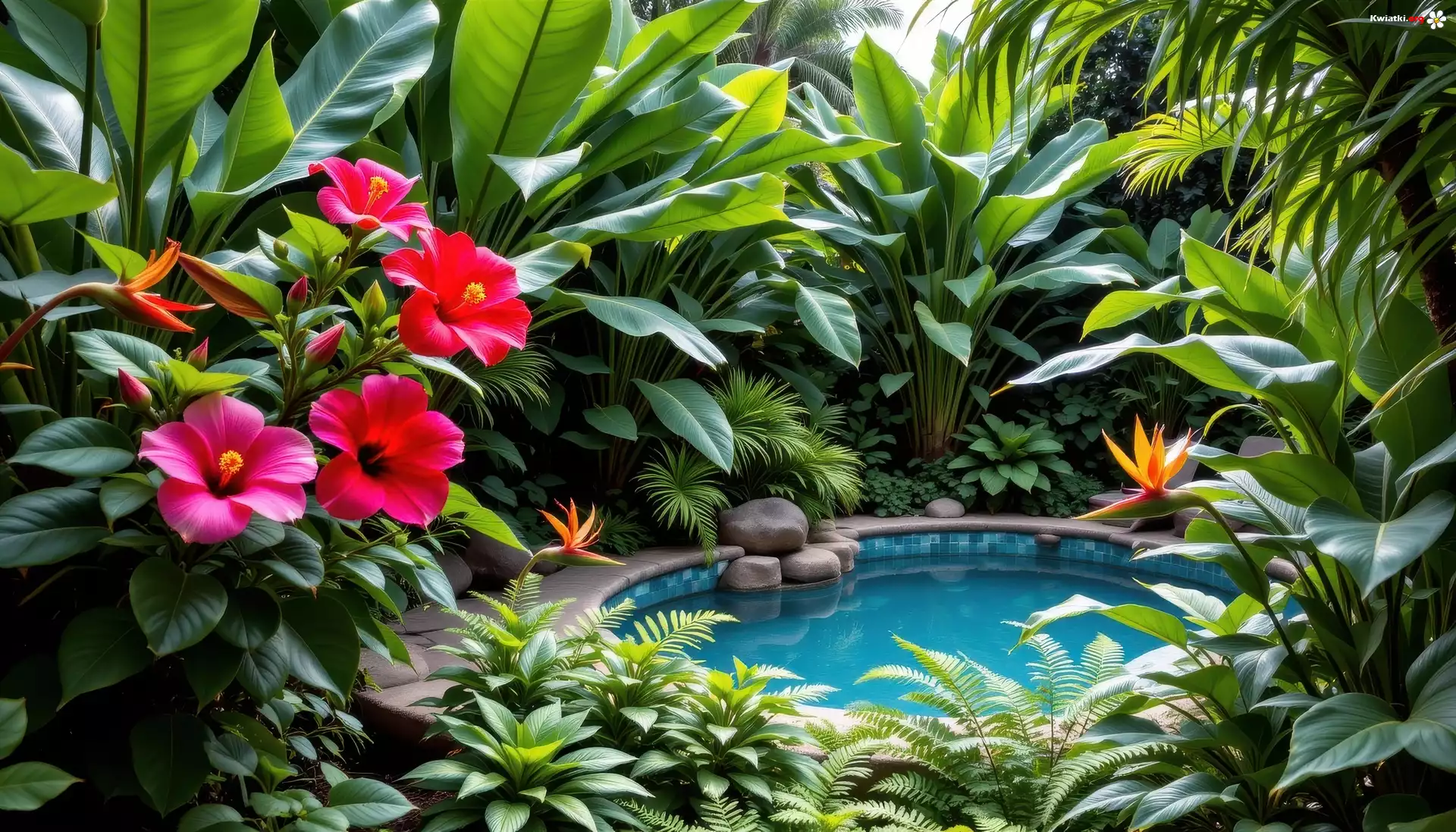 Ogród, Oczko wodne, Kwiaty, Czerwone, Strelicje, Paprocie, Liście, AI - Zdjęcia