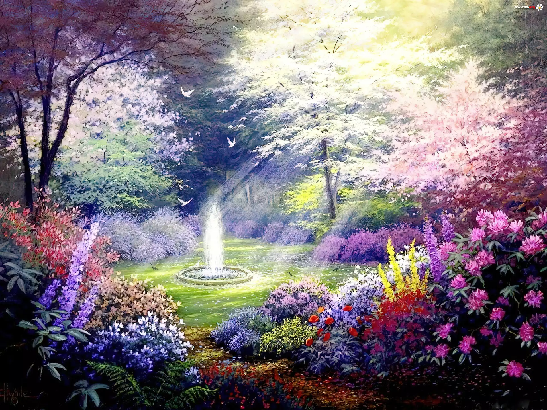Kwiat Ogród, Kwiaty, Fontanna, Promienie, Słoneczne
