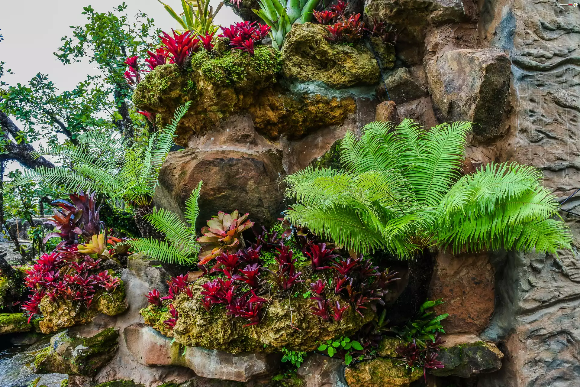 Ogród, Skała, Kwiaty, Rośliny, Paproć - Zdjęcia