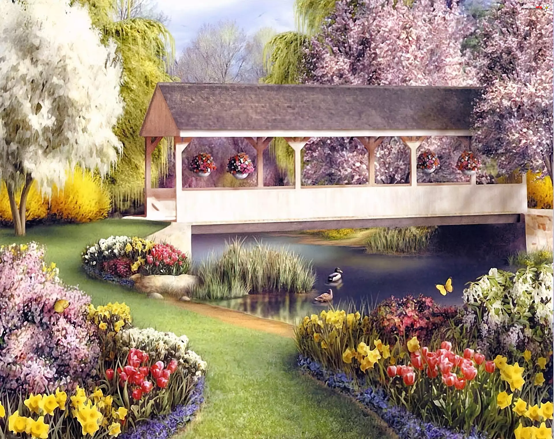 Kwiat Ogród, Kryty, Most, Rzeka, Kwiaty