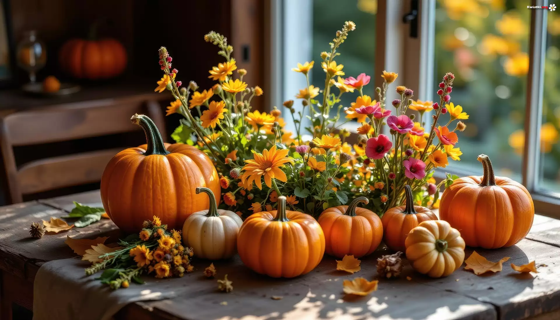 Dynie, Kwiaty, Stół, Okno, Grafika AI - Zdjęcia
