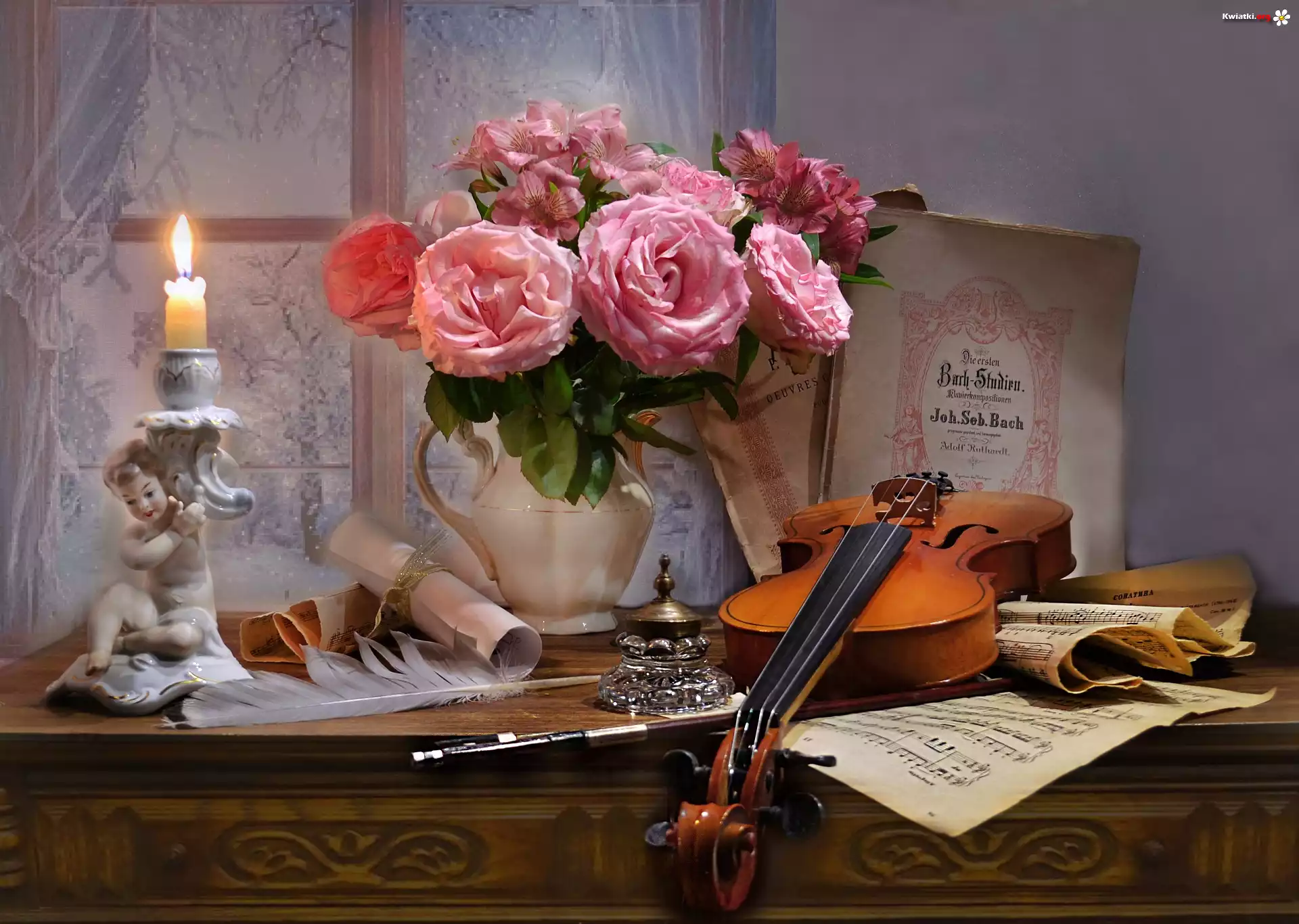 Kwiat Kompozycja, Skrzypce, Nuty, Dzbanek, Alstremerie, Róże, Świeczka, Świecznik, Okno