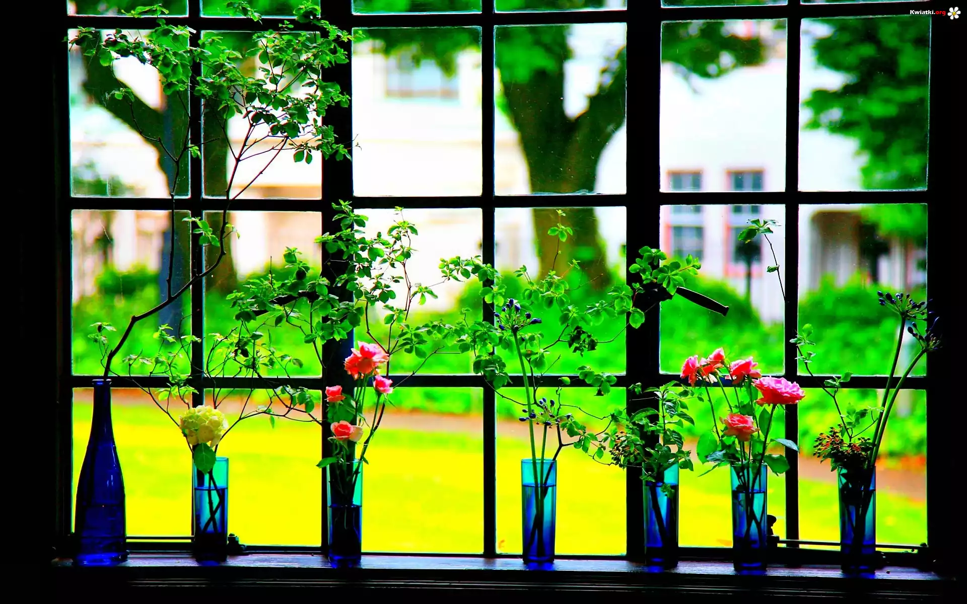 Okno, Wazoniki, Rośliny, Róże, Widok - Zdjęcia