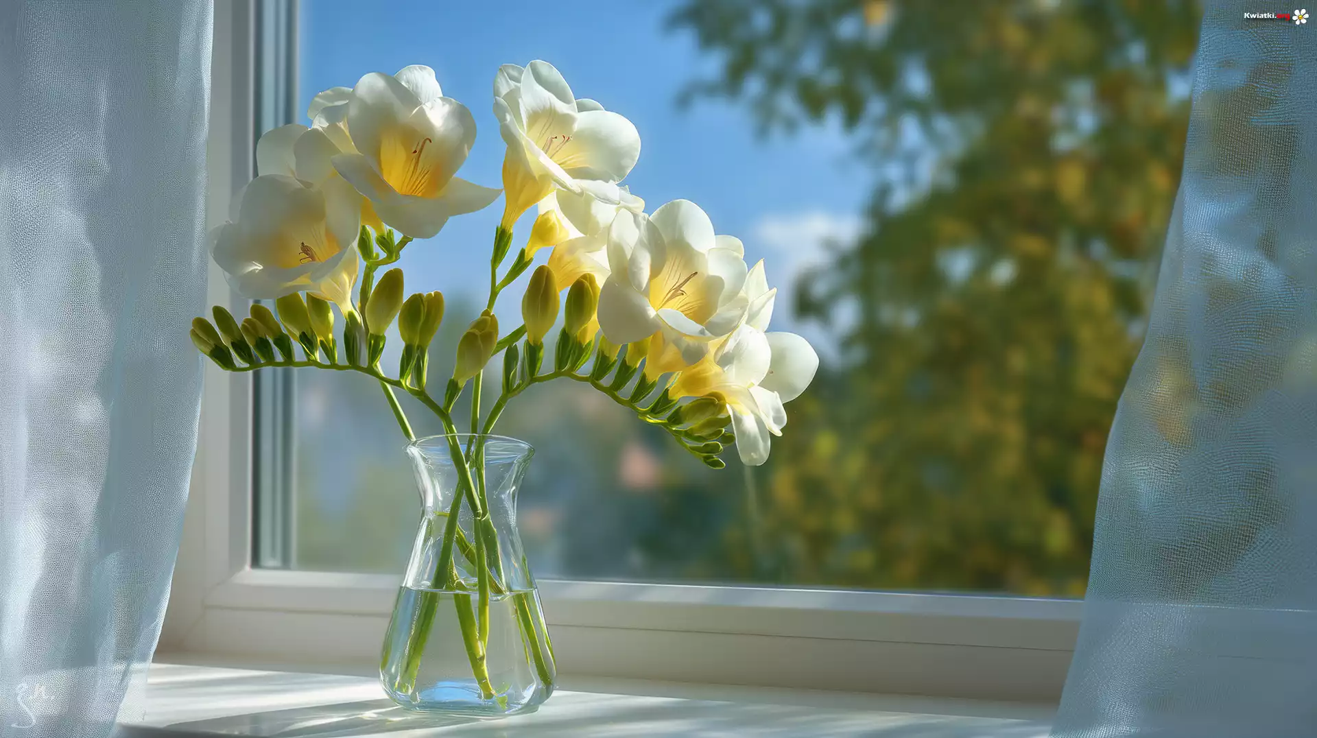 Kwiat Białe, Frezje, Wazonik, Okno, Firanki, Grafika AI