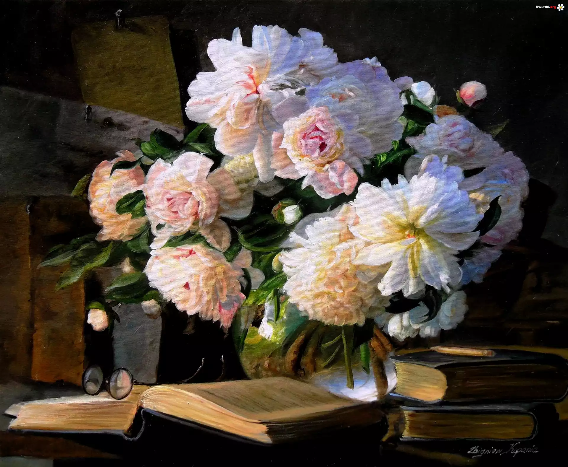 Malarstwo, Obraz, Zbigniew Kopania, Kwiaty, Piwonie, Bukiet, Wazon, Książki, Okulary - Zdjęcia