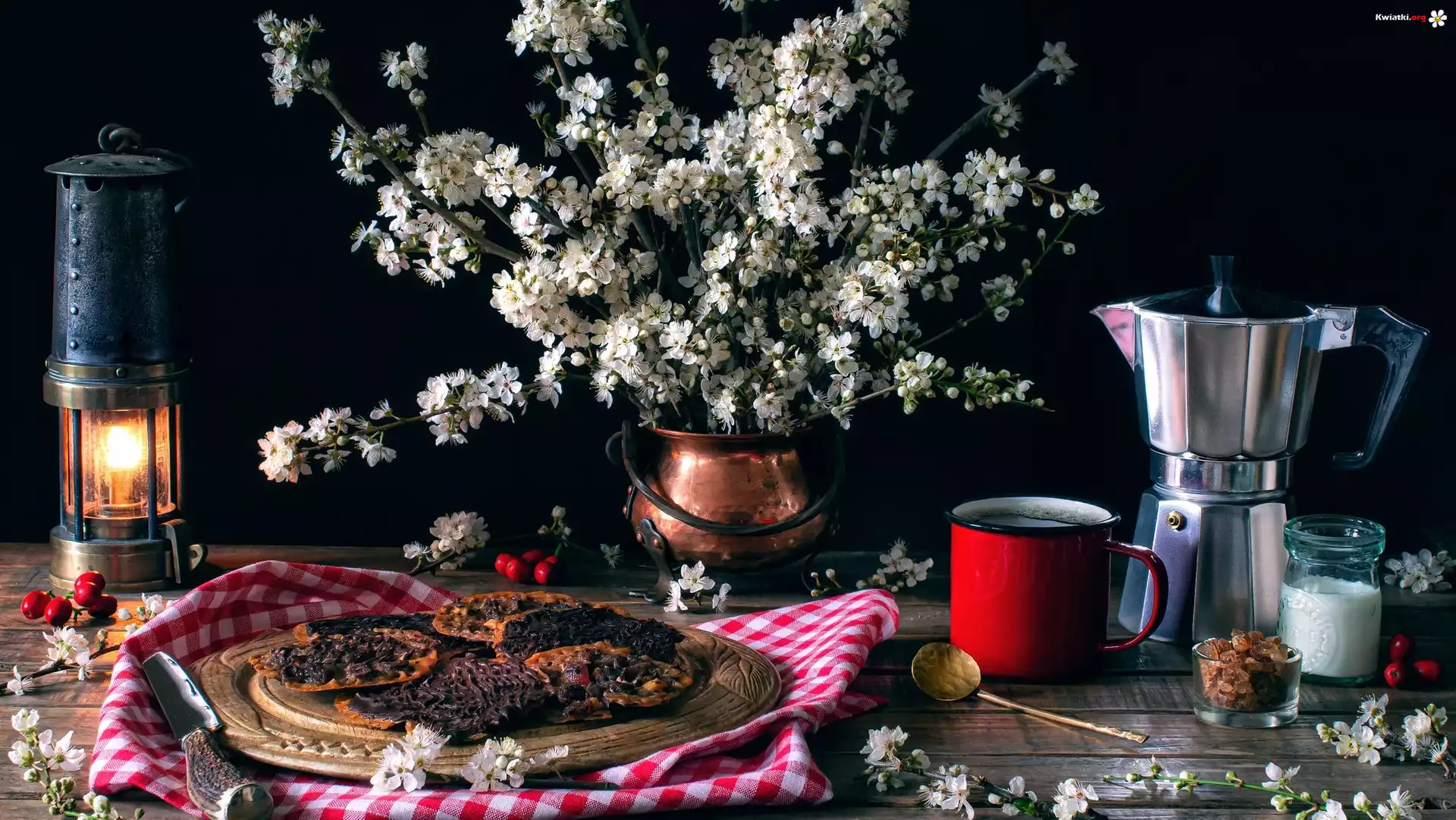 Kompozycja, Bukiet, Okwiecone, Gałązki, Lampa, Kawiarka, Garnuszek, Kawa, Ciastka, Florentynki, Serwetka - Zdjęcia |