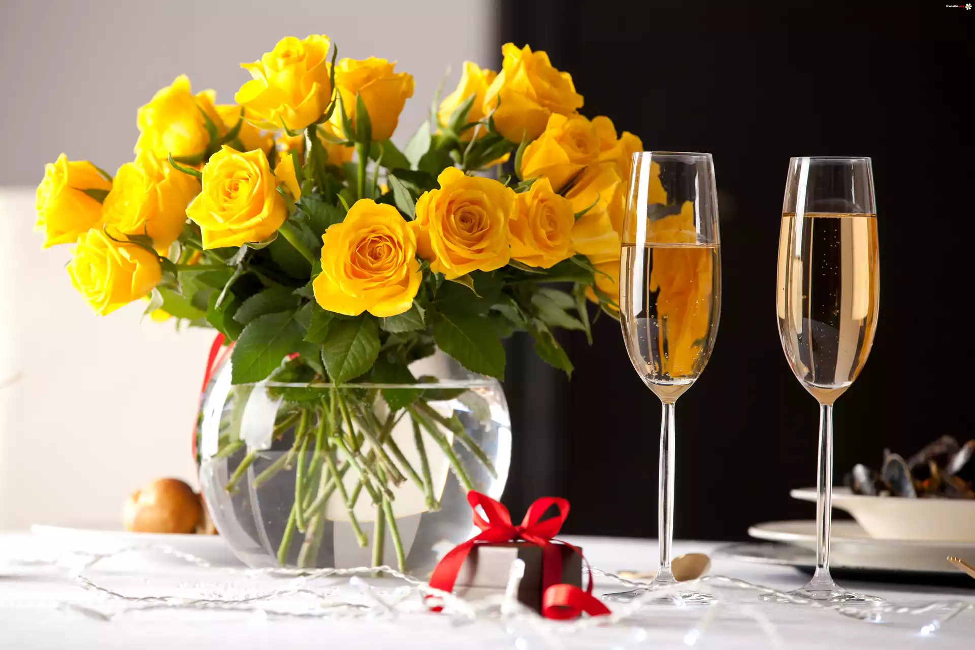 Kwiat Wazon, Żółte, Róże, Kieliszki, Białe, Wino, Prezent