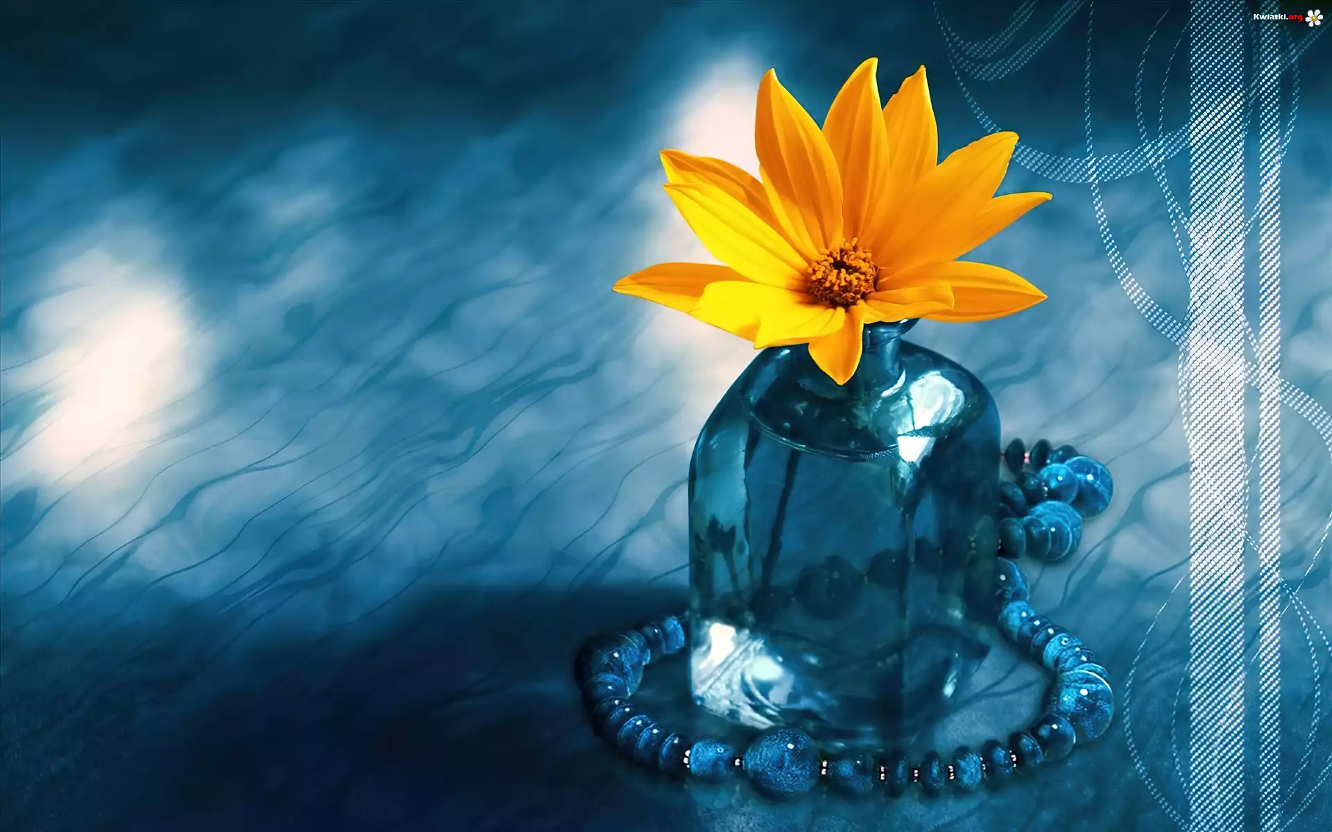 Kwiat Żółty , Kwiat, Korale, Wazonik, Niebieskie, Tło