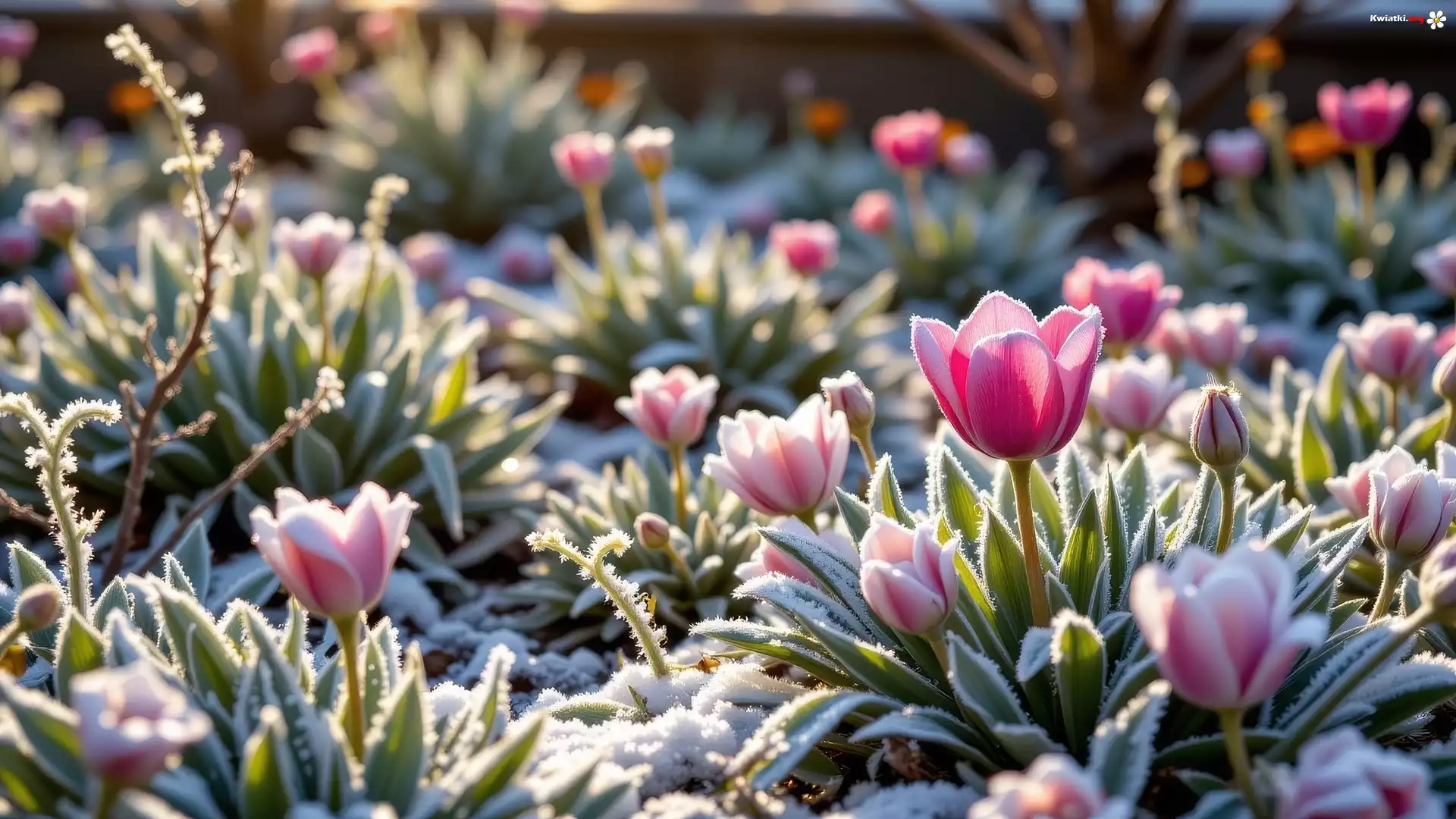 Różowo-białe, Tulipany, Oszronione, Zielone, Listki - Zdjęcia