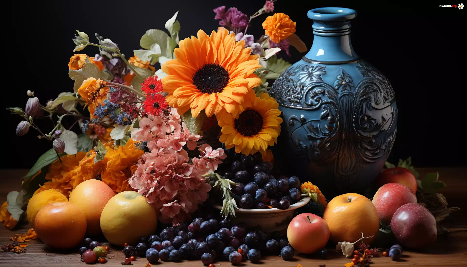 Kwiaty, Kolorowe, Liście, Owoce, Jabłka, Winogrona, Miska, Wazon, Deski, Czarne, Tło, Grafika, Kompozycja - Zdjęcia |