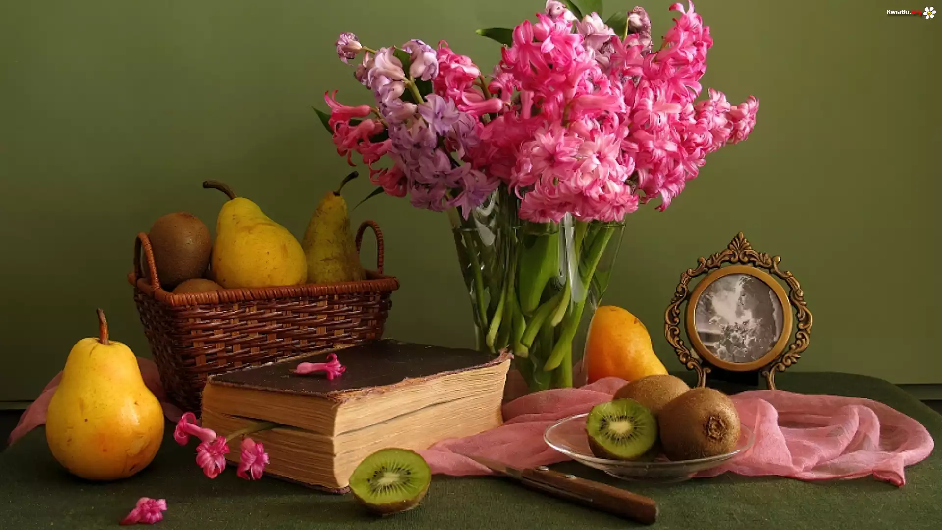 Hiacynty, Owoce, Książki - Zdjęcia