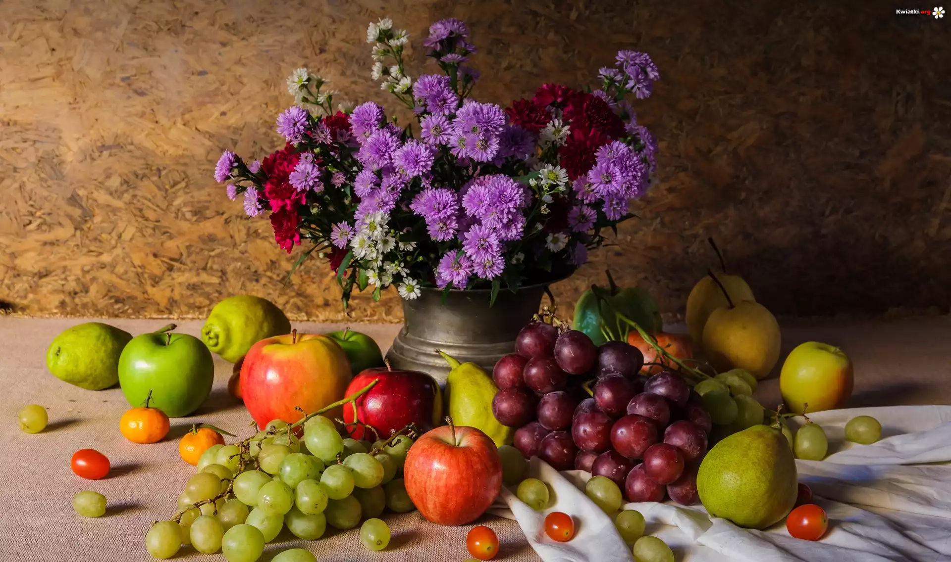 Wazon, Bukiet, Kwiaty, Astry marcinki, Owoce, Jabłka, Gruszki, Winogrona, Cytryny, Pomidory koktajlowe - Zdjęcia |