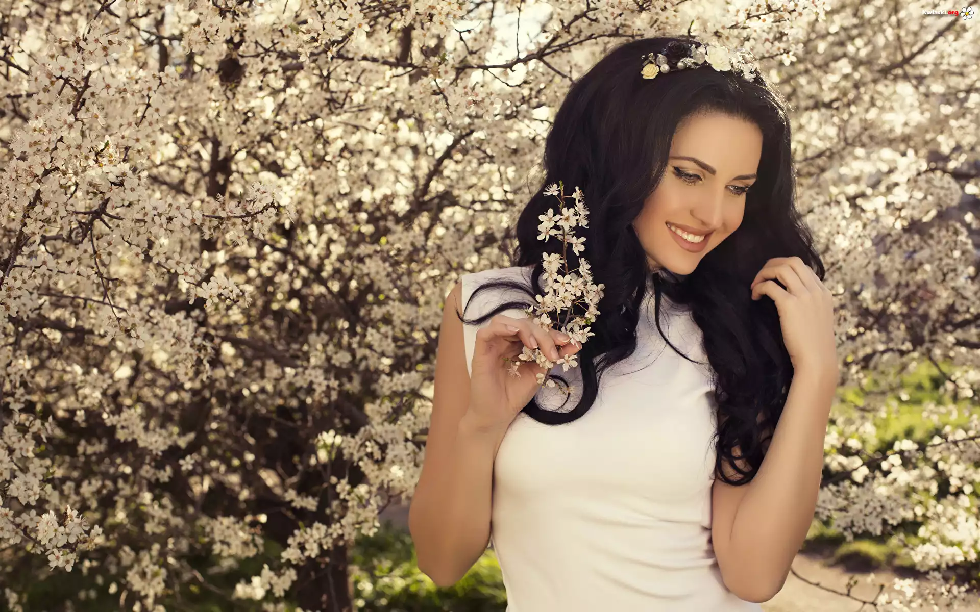 Drzewo owocowe, Gałązki, Kwiaty, Kobieta, Uśmiech, Długowłosa - Zdjęcia