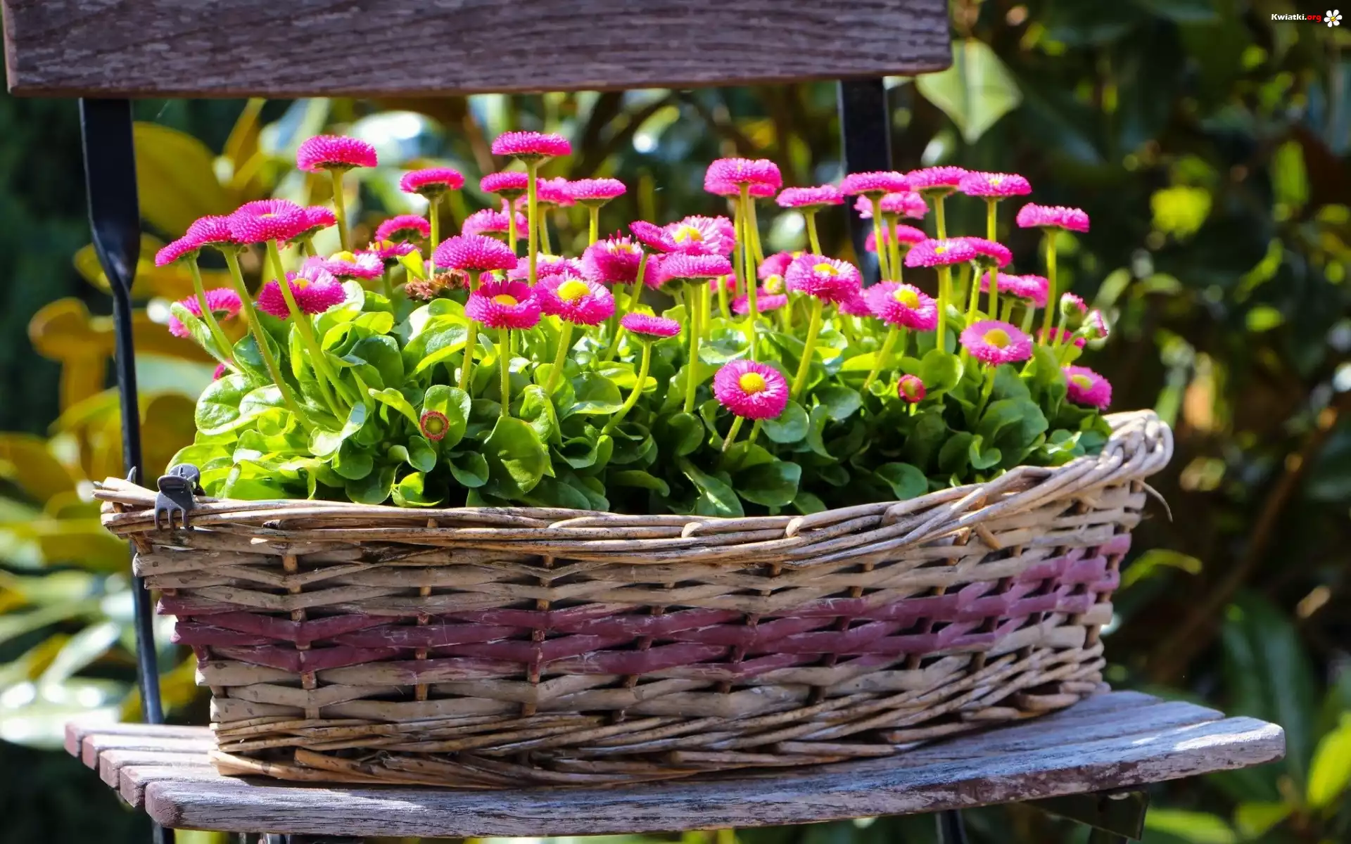Ozdobne, Stokrotki, Kosz, Ławka, Ogród - Zdjęcia