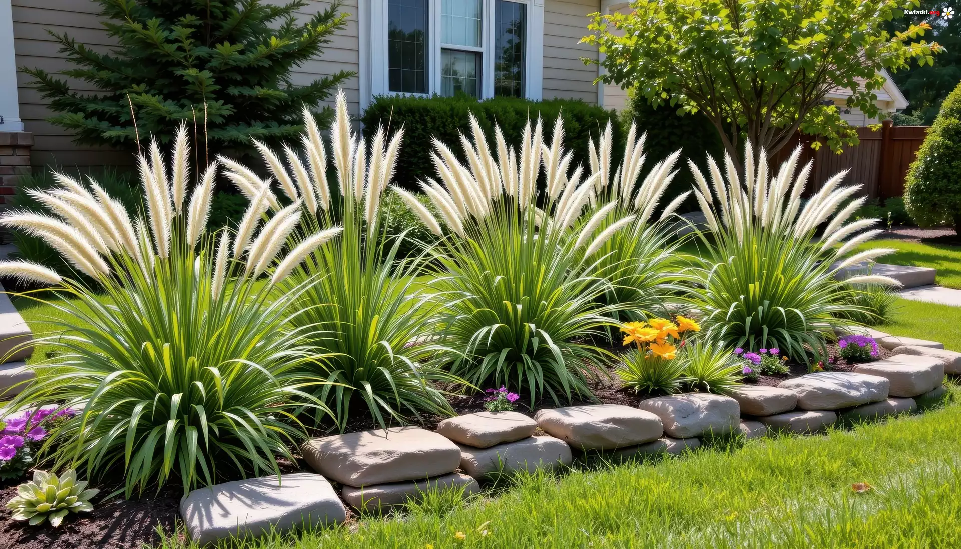 Ogród, Klomb, Trawy ozdobne, Drzewa, Kwiaty Ogród, Trawy ozdobne, Kwiaty, Grafika AI Trawy ozdobne, Kwiaty, Ogród, Grafika AI Trawa ozdobna, Źdźbła