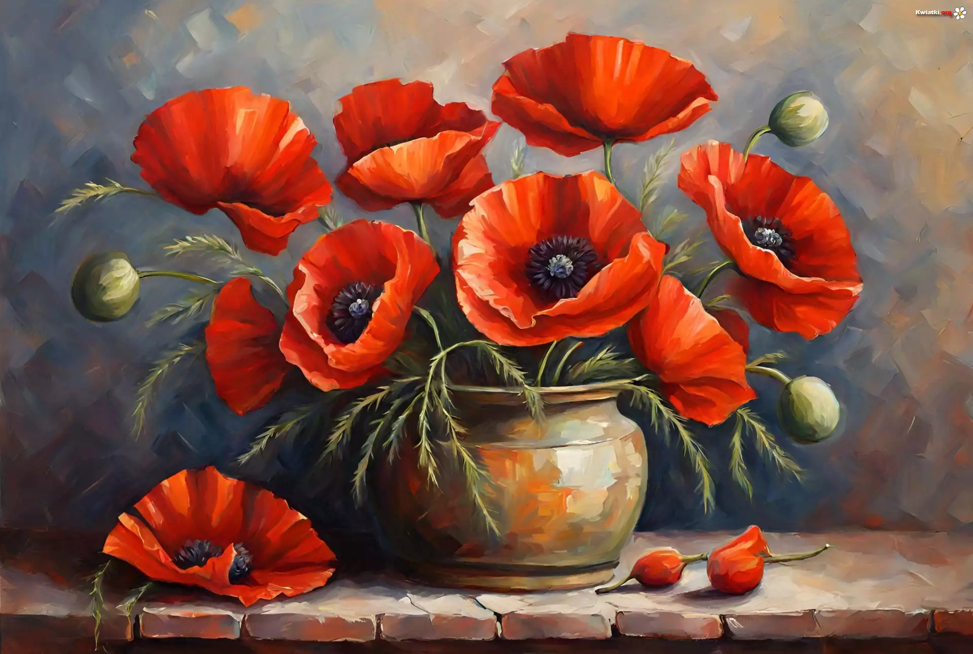 Kwiaty, Czerwone, Maki, Pąki, Wazon, Grafika - Zdjęcia