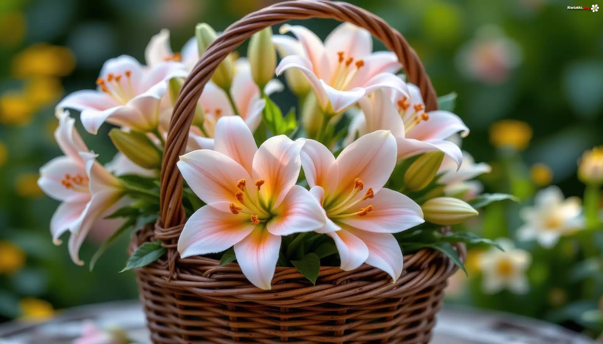 Kwiat Biało-pomarańczowe, Lilie, Pąki, Wiklinowy, Koszyk