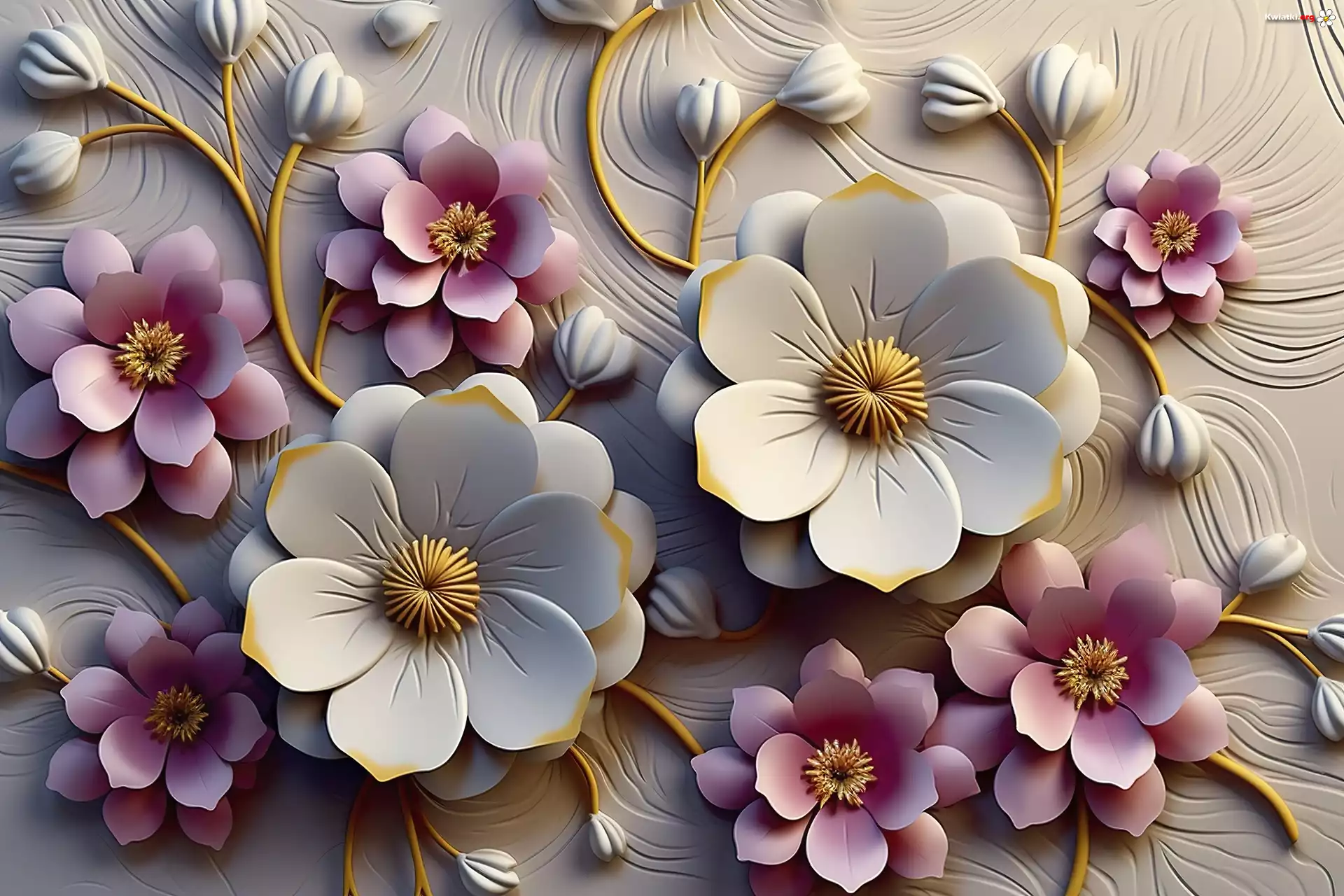 Białe, Różowe, Kwiaty, Pąki, Złote, Gałęzie, Grafika - Zdjęcia