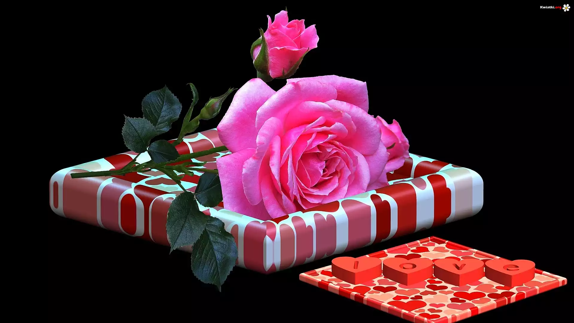 Kwiat Różowa, Róża, Pąki, Listki, Serduszka, Podstawki, Napis, Love, Czarne, Tło, Grafika