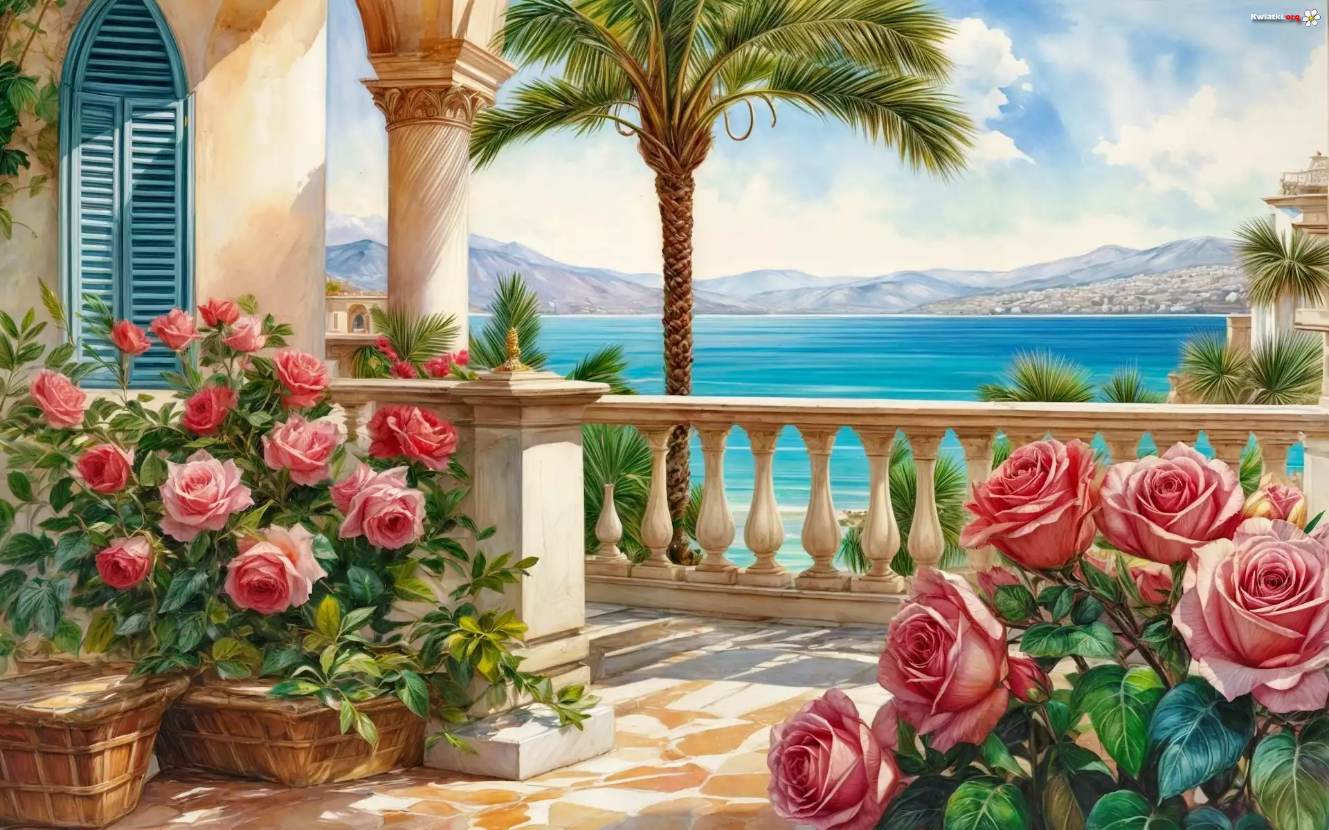 Grafika, Morze, Balkon, Palma, Kwiaty, Róże, Dom - Zdjęcia