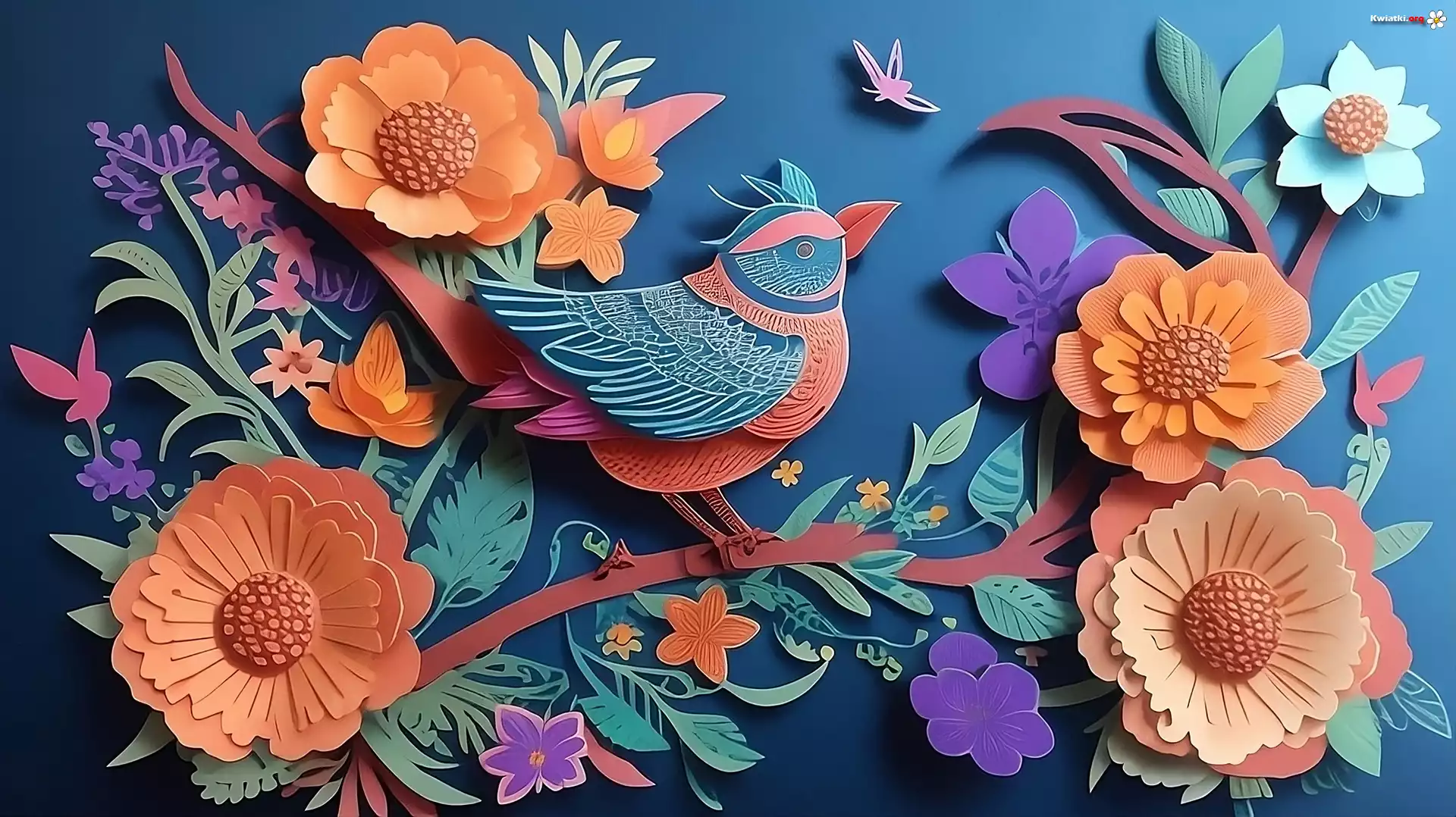 Grafika, Papierowe, Pomarańczowe, Kwiaty, Ptak - Zdjęcia