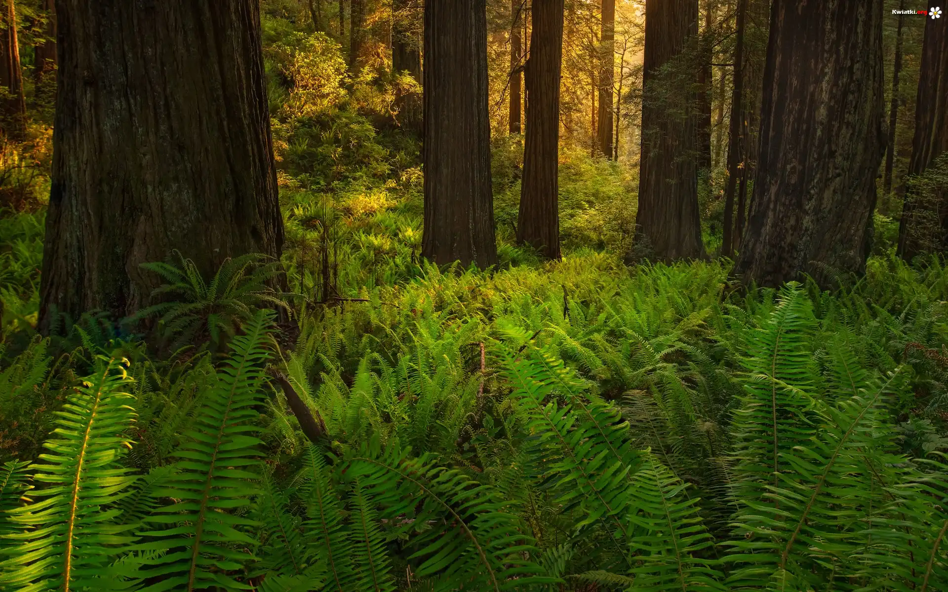 Kwiat Stany Zjednoczone, Kalifornia, Park Narodowy Redwood, Las, Drzewa, Paprocie