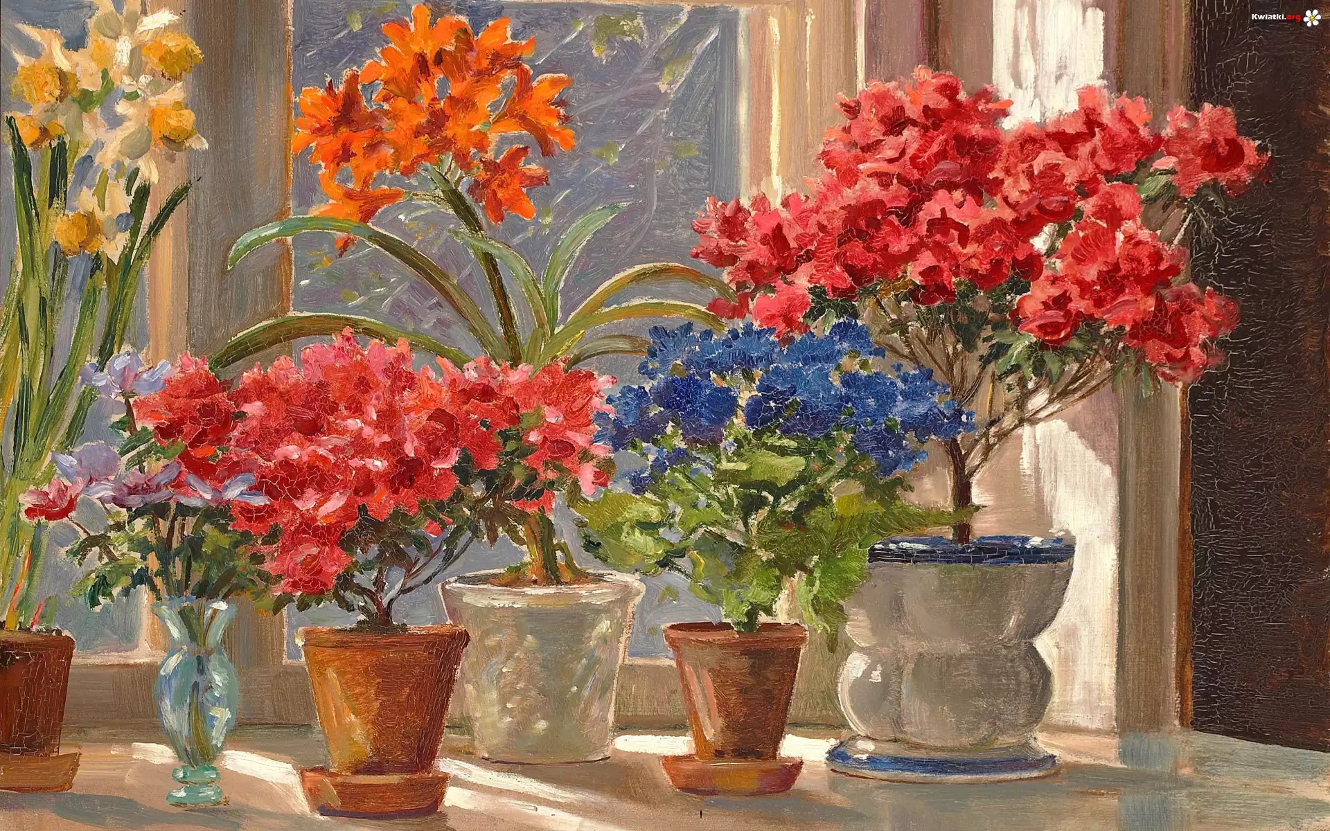 Kwiat Obraz, Malarstwo, Olga Aleksandrowna Romanowa, Kwiaty, Doniczki, Wazon, Okno, Parapet