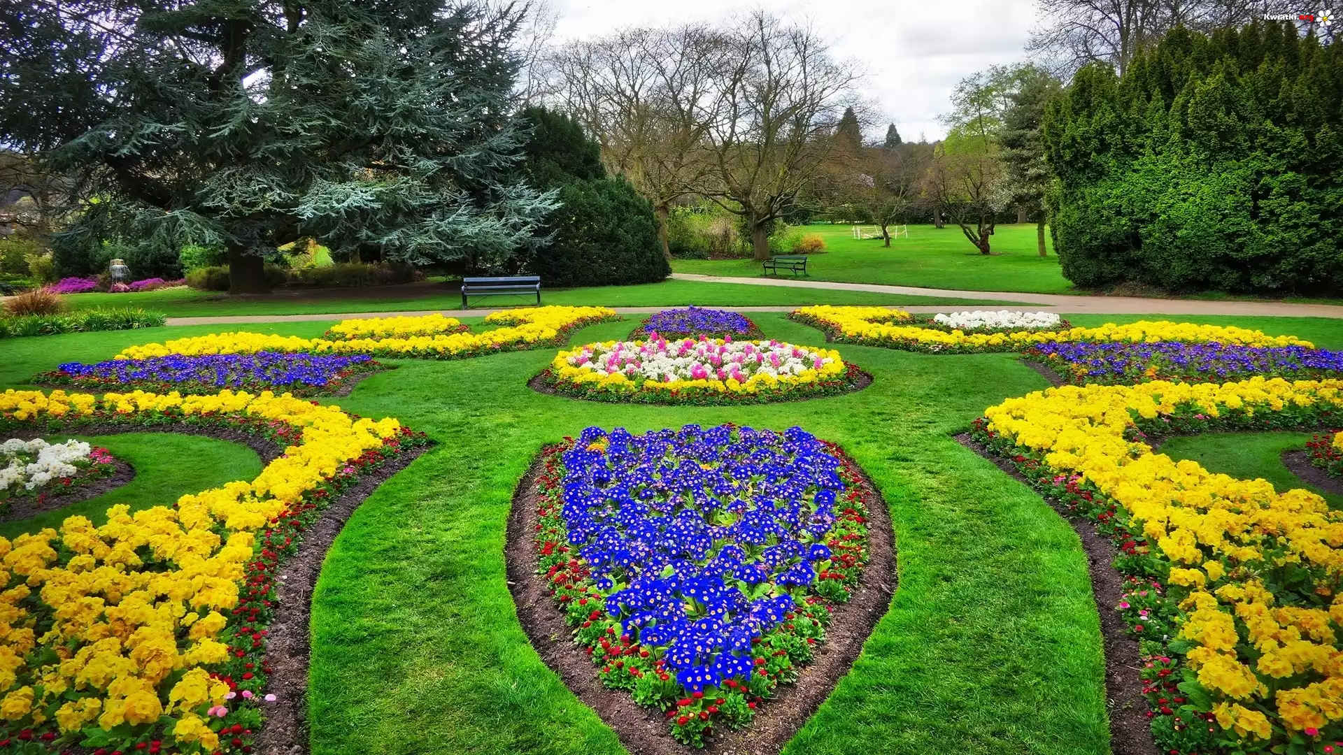 Park, Żółte, Niebieskie, Kwiaty, Drzewa, Ławki - Zdjęcia