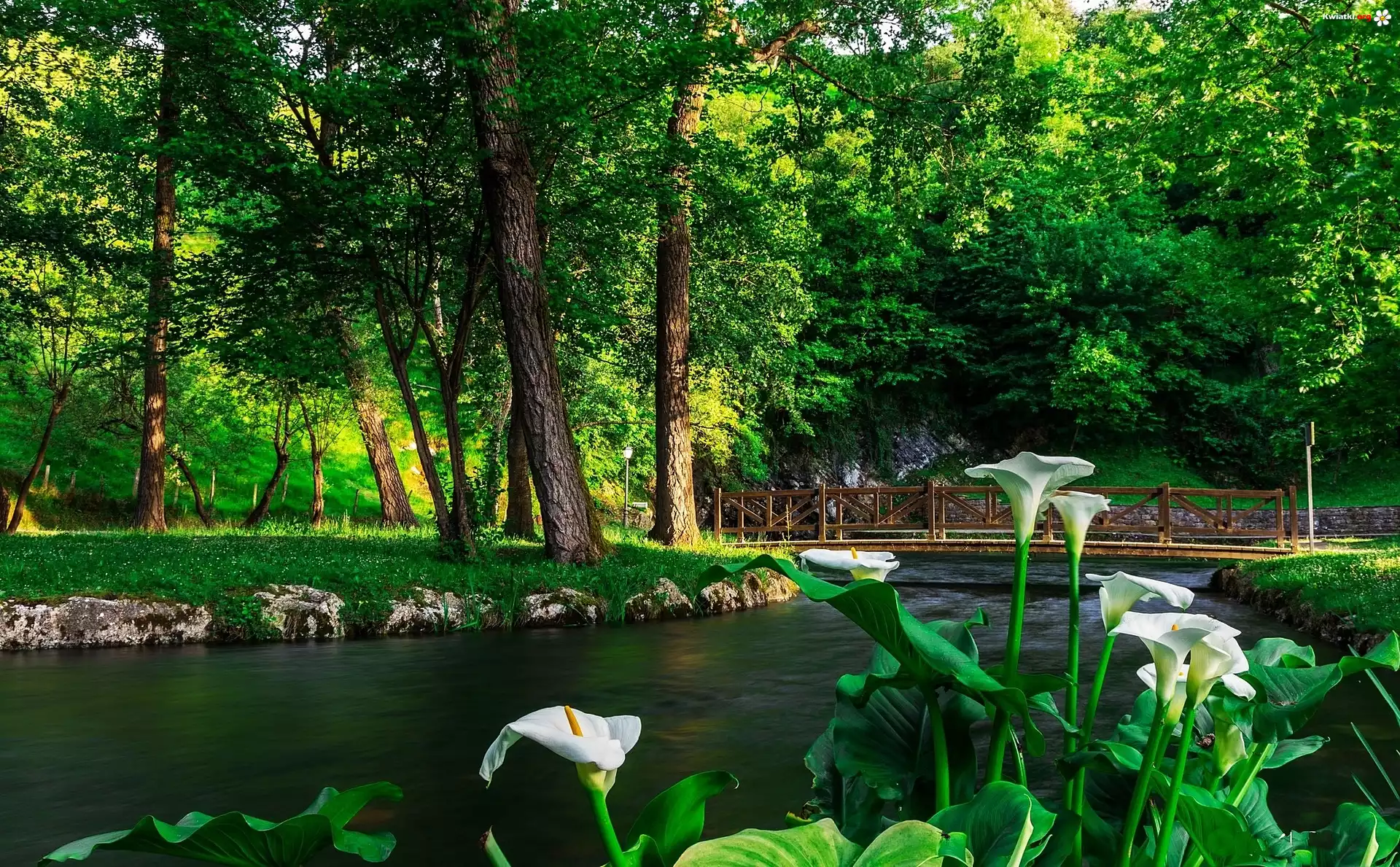 Kwiat Park, Lato, Rzeka, Most, Kalie, Drzewa