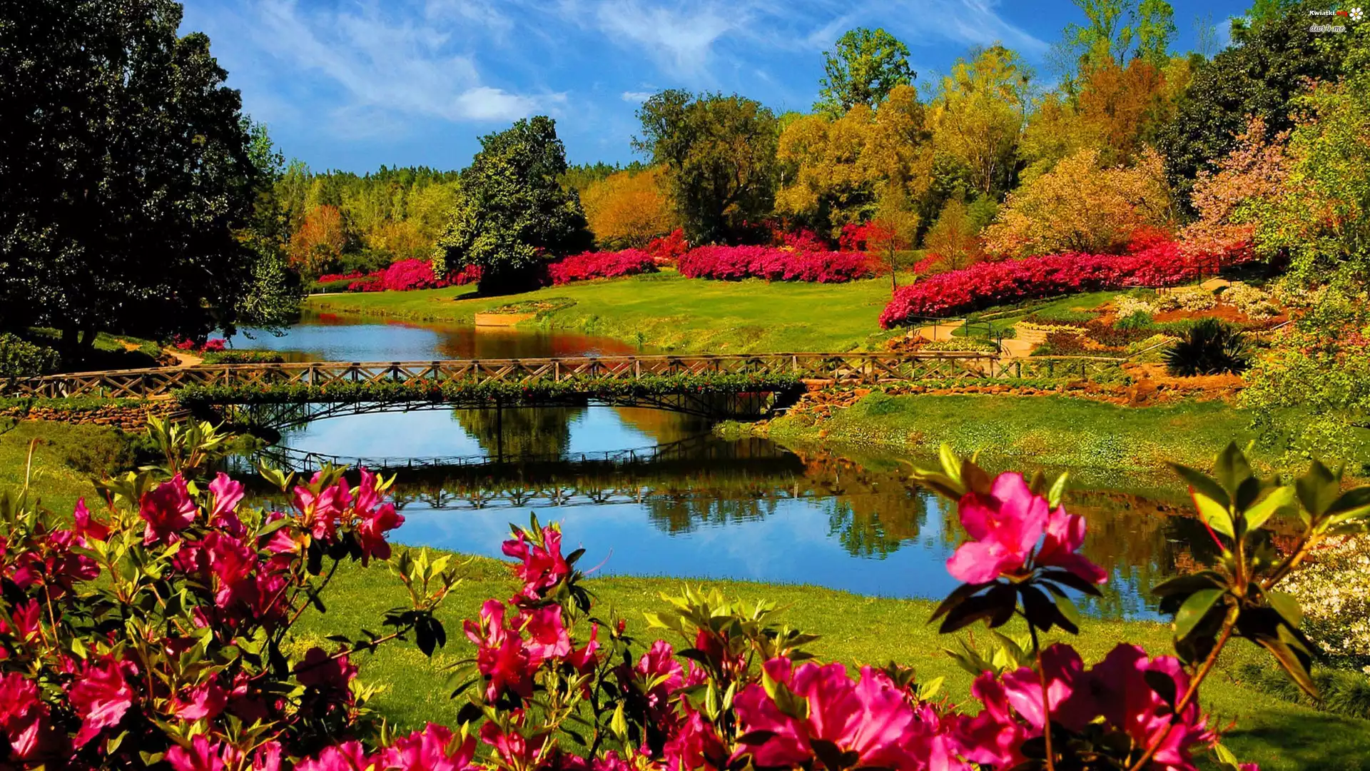 Kwiat Park, Rzeczka, Mostek, Kwiaty, Drzewa