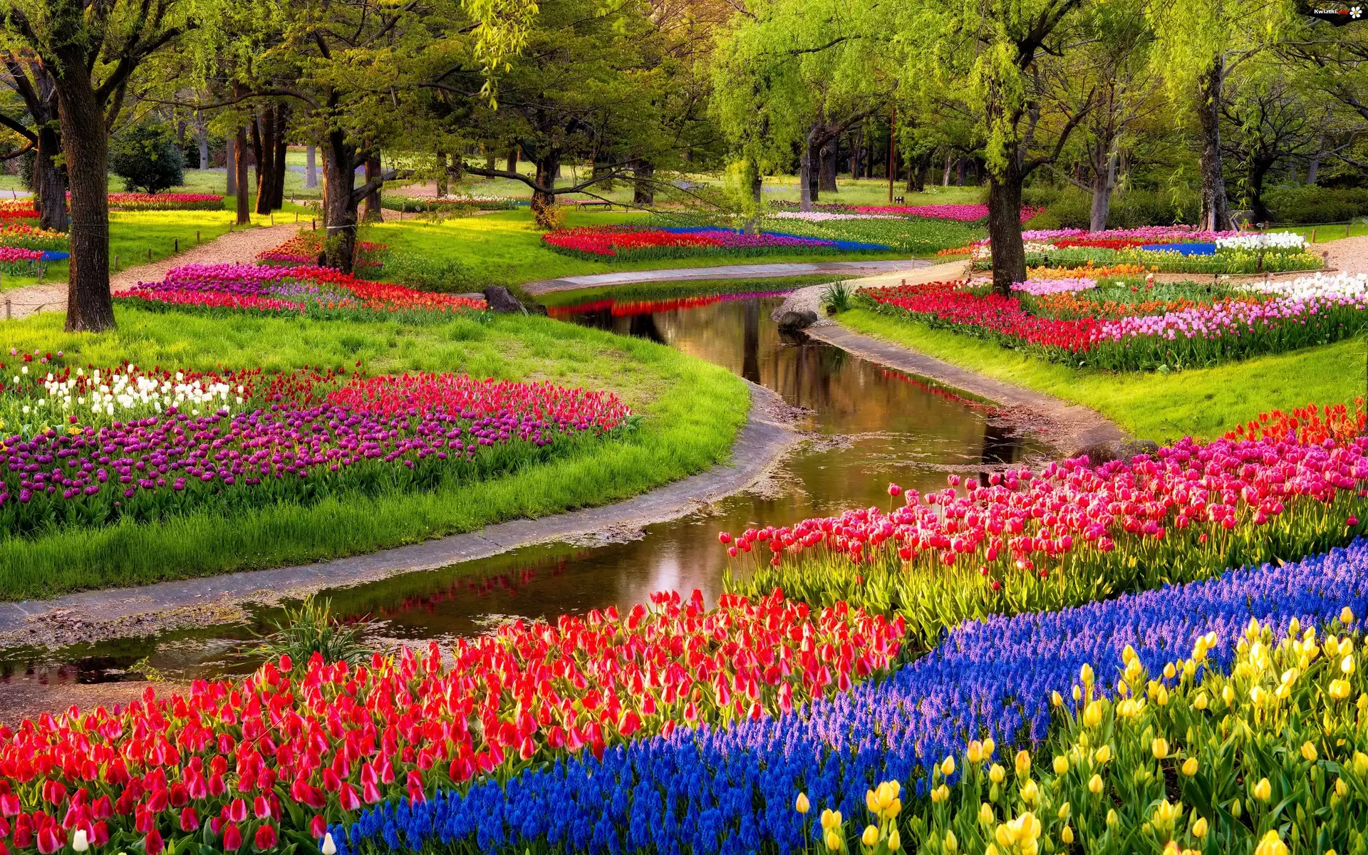 Park, Rzeczka, Kwiaty, Tulipany - Zdjęcia