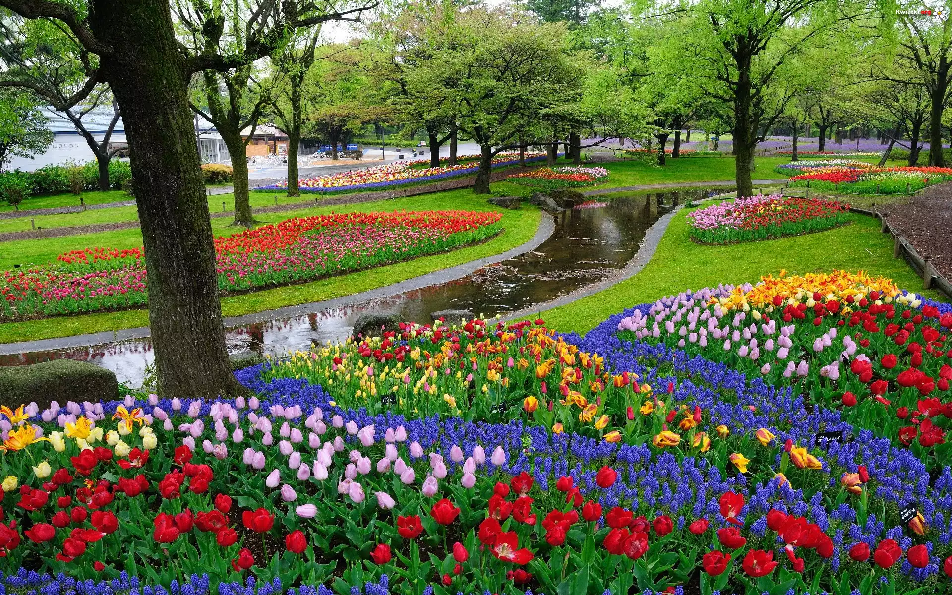 Kwiat Park, Drzewa, Rzeczka, Tulipany