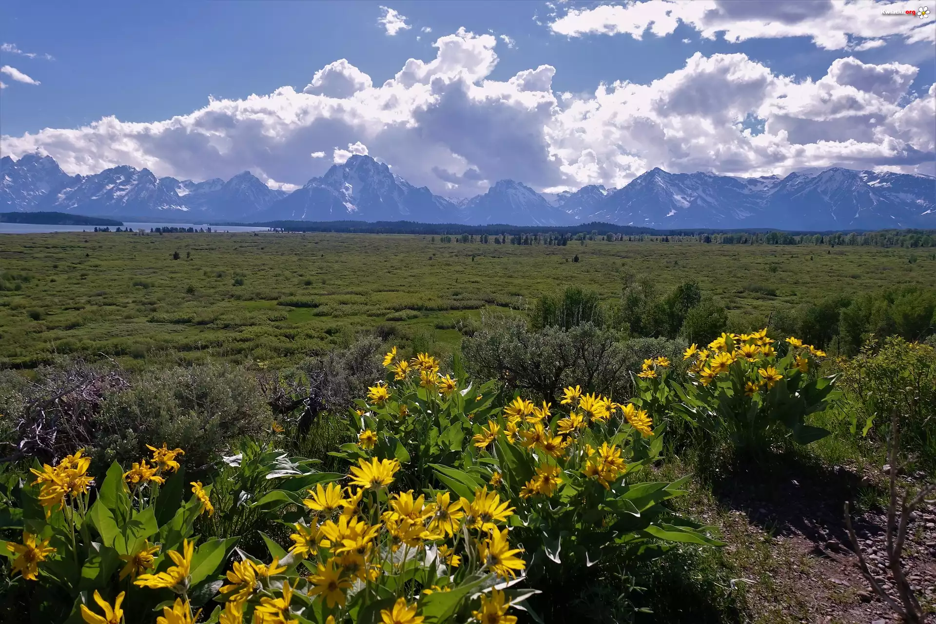 Park Narodowy Grand Teton, Żółte, Kwiaty, Polana, Chmury, Góry, Teton Range, Stan Wyoming, Stany Zjednoczone - Zdjęcia |
