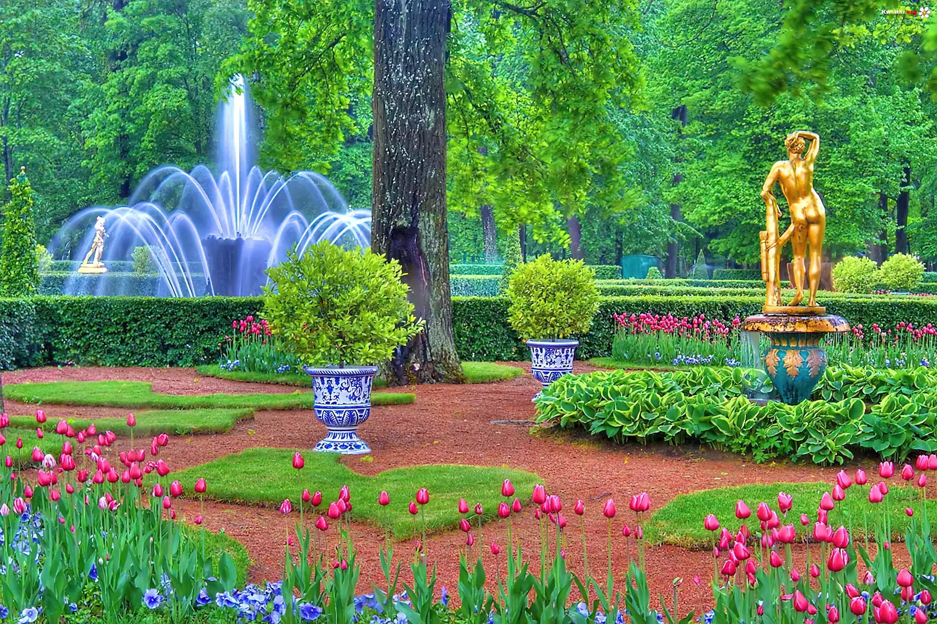 Park, Fontanna, Tulipany, Złoty, Posąg - Zdjęcia