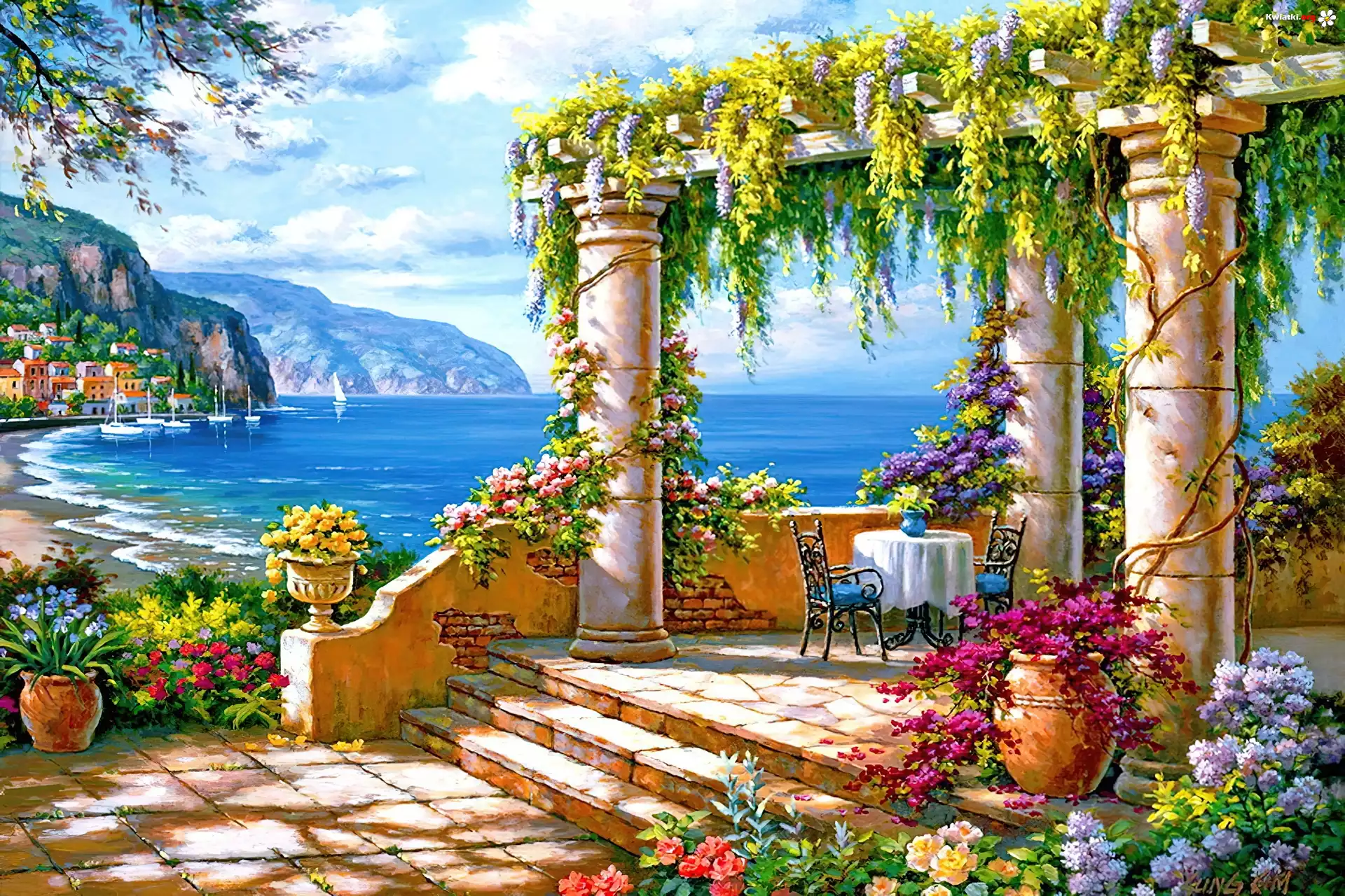 Taras, Patio, Kwiaty, Stolik, Morze, Góry, Widok - Zdjęcia