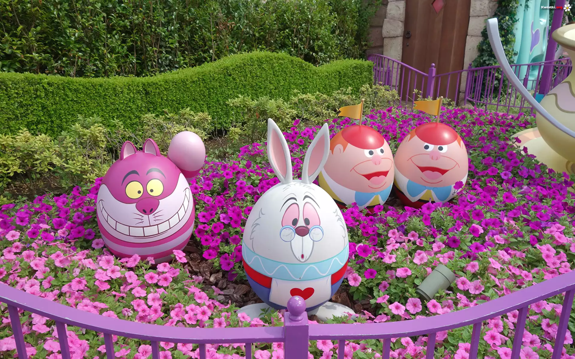 Kwiat Park, Rabatka, Petunie, Ogrodzenie, Figurki, Jajka, Dekoracja Petunia ogrodowa