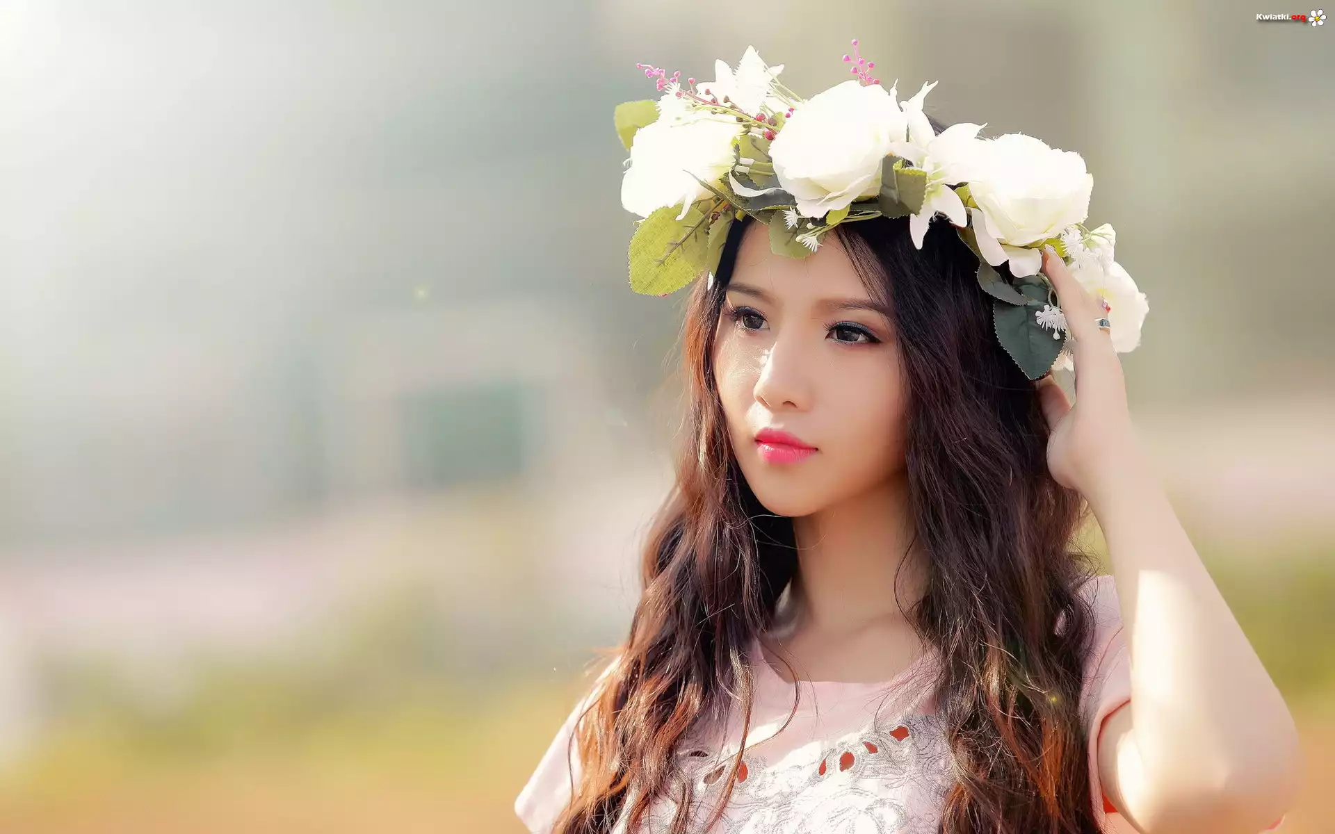 Piękna, Japoneczka, Makijaż, Wianek, Z, Róż - Zdjęcia